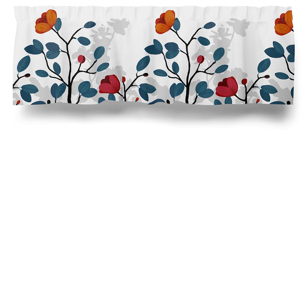 Gardinkappa med vit botten, blå blad och röda blommor.