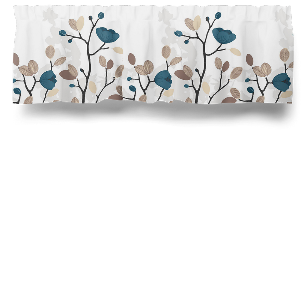 Vit botten med guld-beiga blad som glittrar och petrol färgade blommor