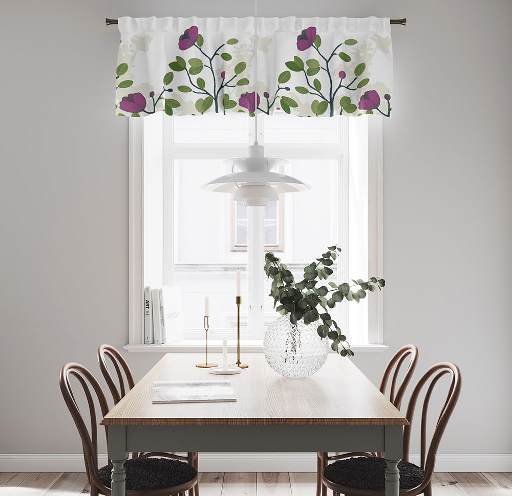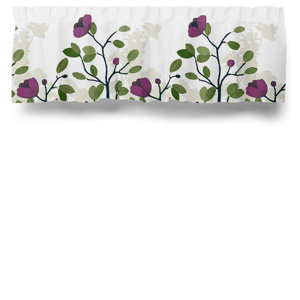 Gardinkappa på metervara med gröna blad och plommon blommor