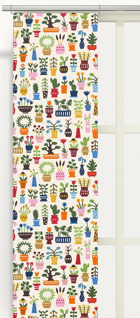 Panelgardiner med färgstarkt mönster av blommor och blomkrukor i härliga färger.