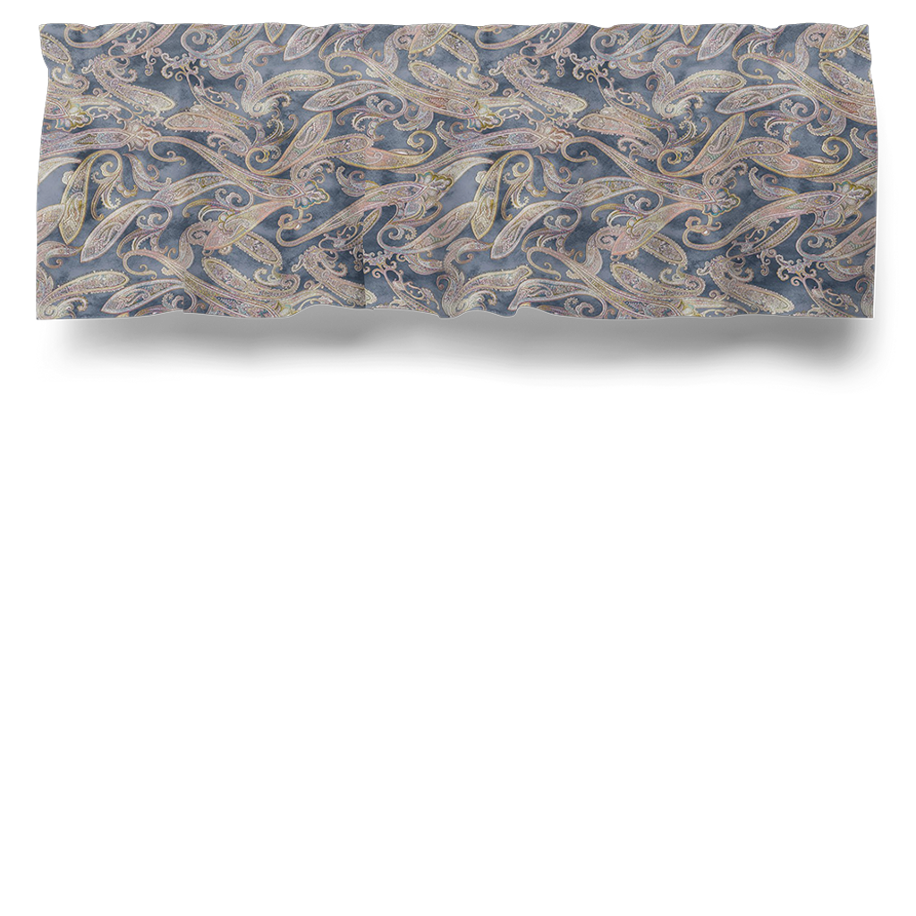 Gardinkappa på metervara med multiband och ofållade sidor. En gardinkappa med paisleymönster i beige och blått.