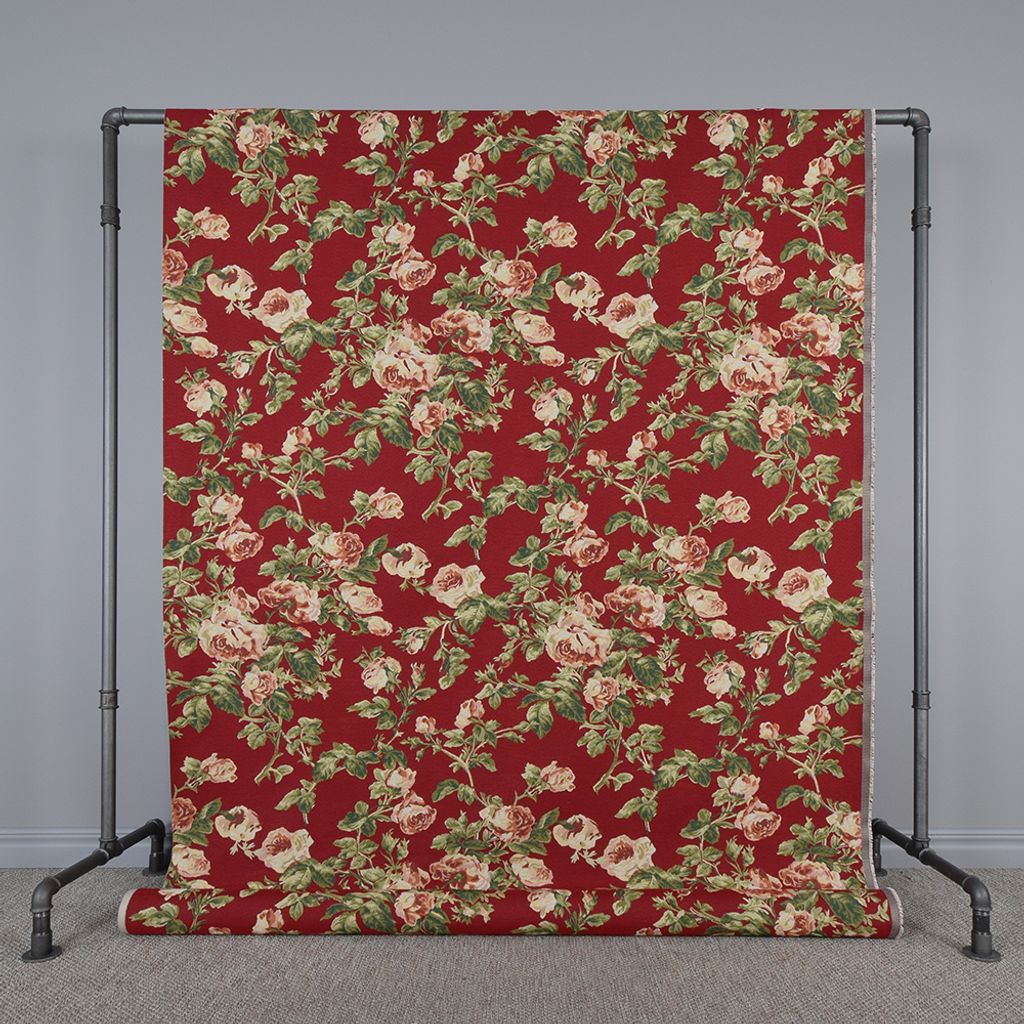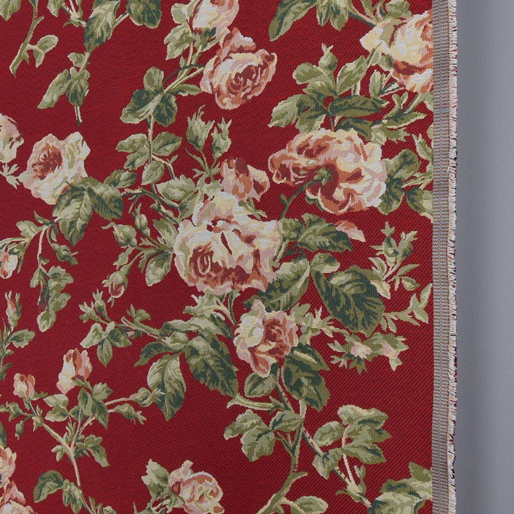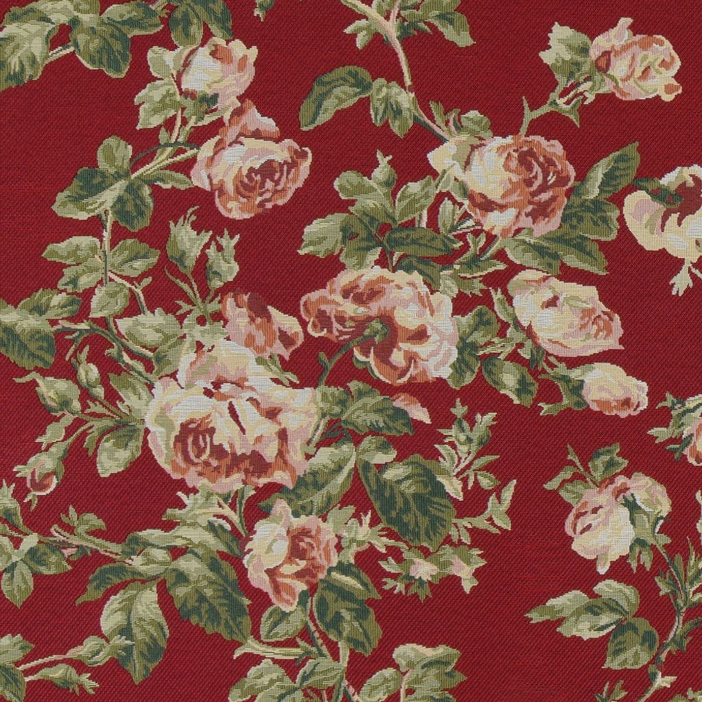Röd botten med rosor och gröna blad blommor, gobeläng tyg på metervara.