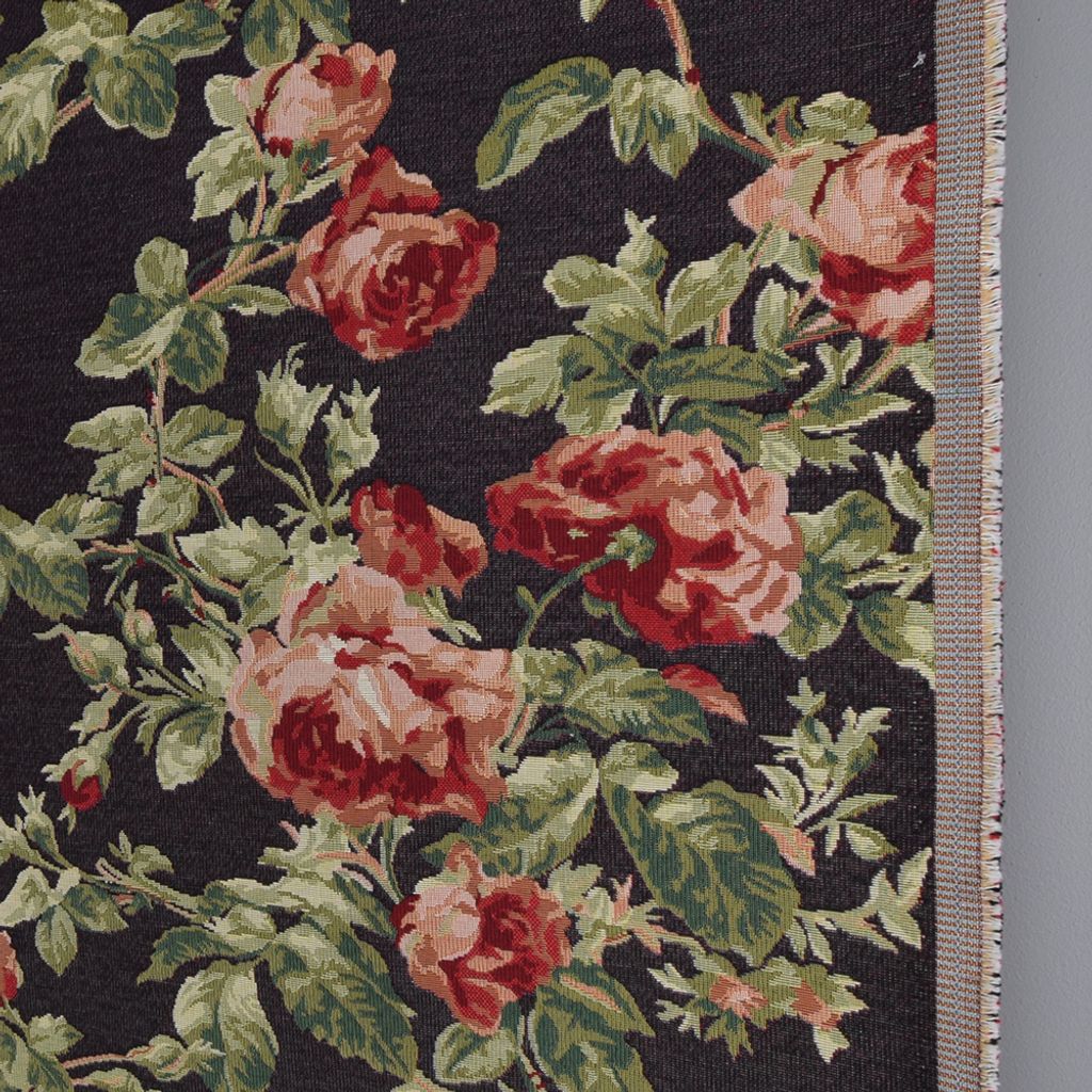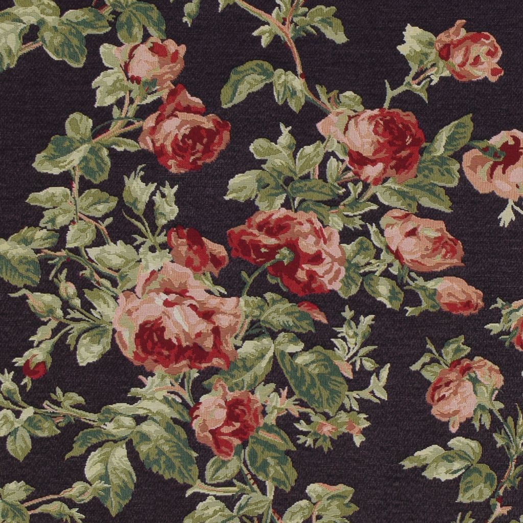 Svart botten med rosor och gröna blad blommor, gobeläng tyg på metervara.