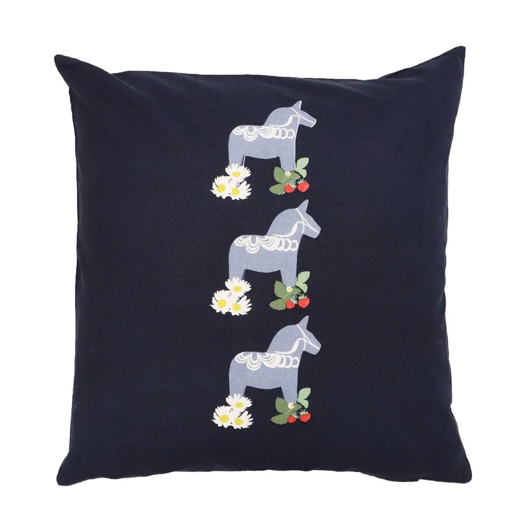 Mörkblått kuddfodral i bomull med ljusblå dalahästar och blommor. Mönster på båda sidorna. Blixtlås i botten.