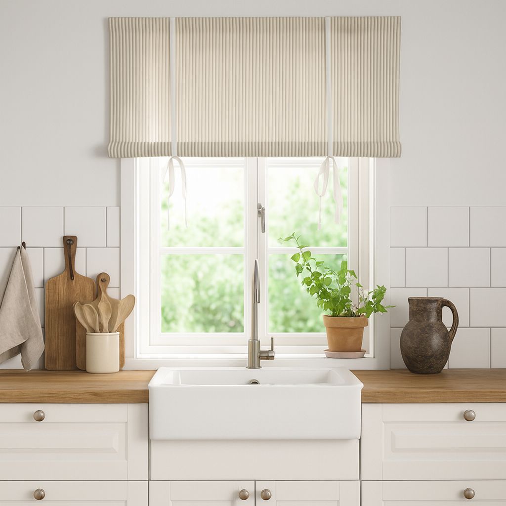 Vacker gammeldags hissgardin eller rullkappa med vita och beiga ränder.