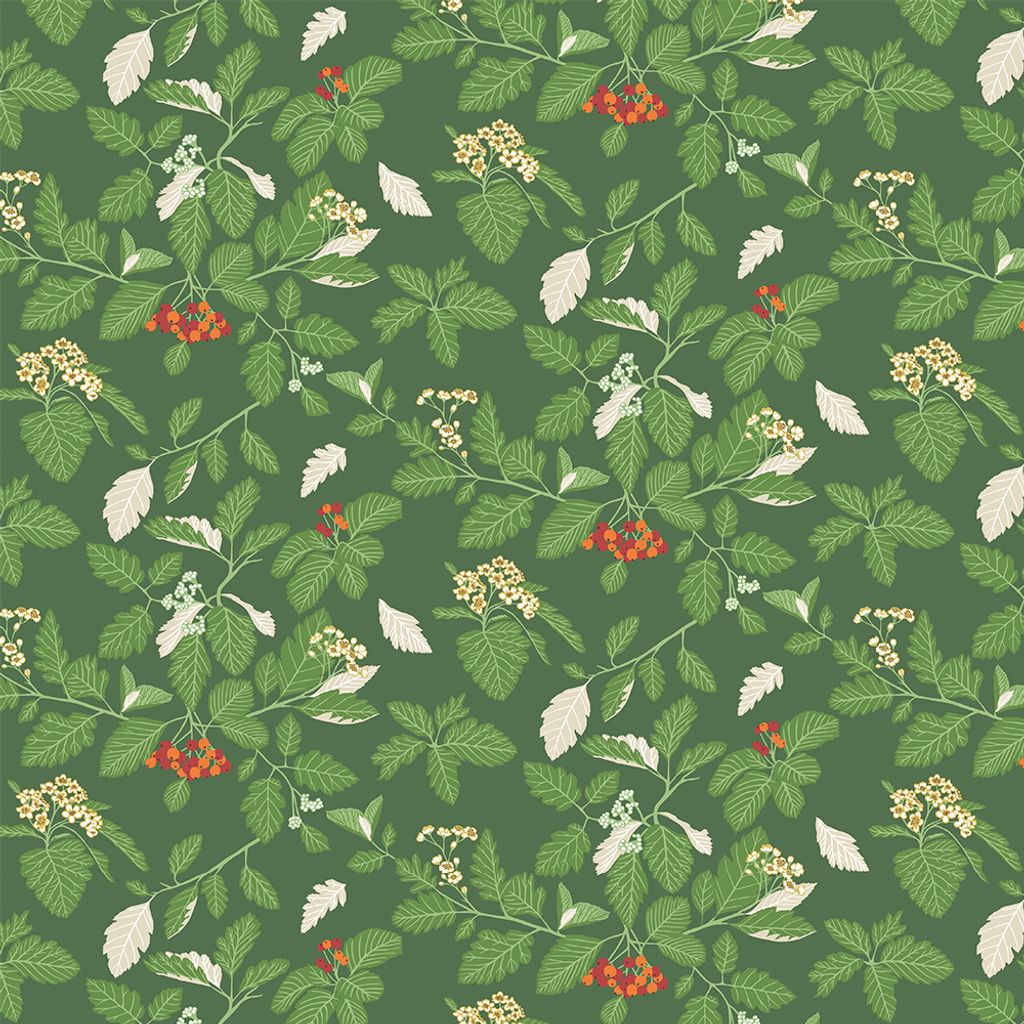 Bomullstyg med gröna oxelblad och röda bär. Ett livfullt mönster med naturkänsla – passar perfekt till gardiner och textil inredning.