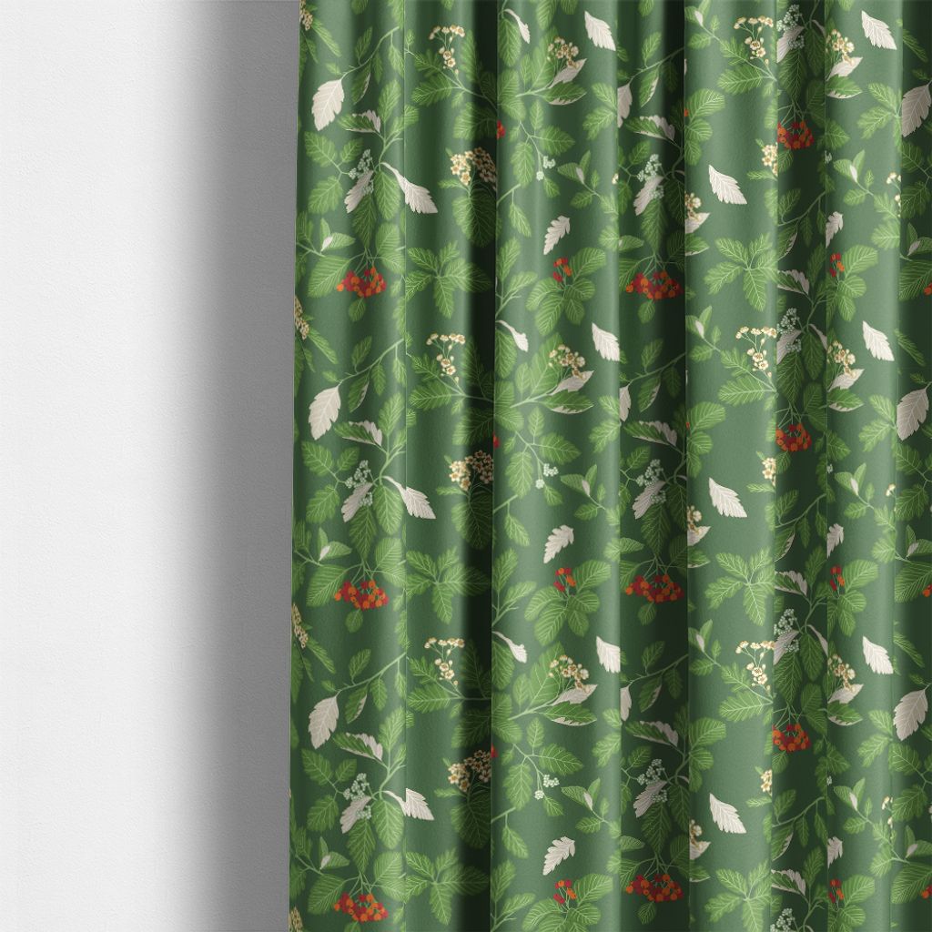 Bladmönstrat grönt bomullstyg med röda bär – perfekt för gardiner och inredningsprojekt.