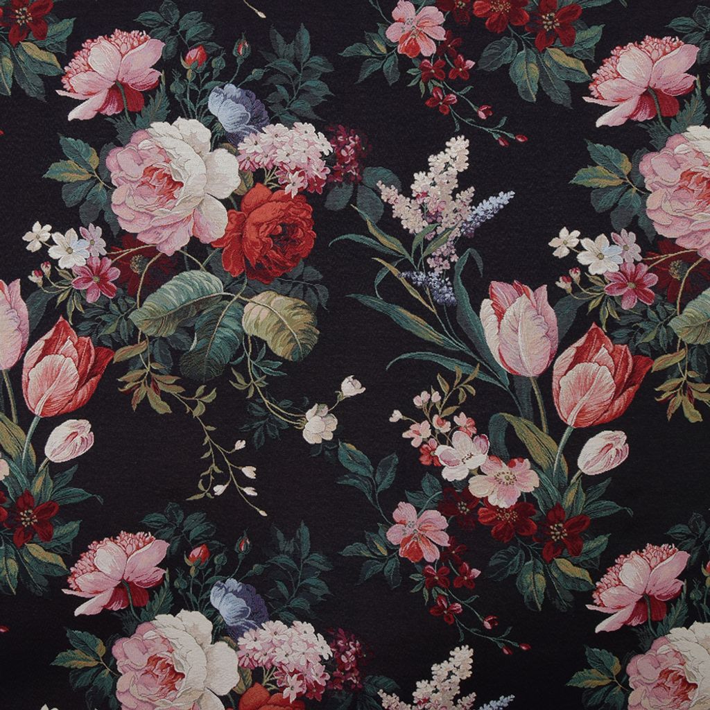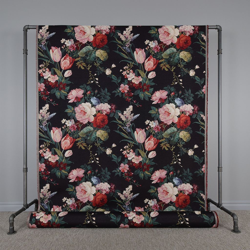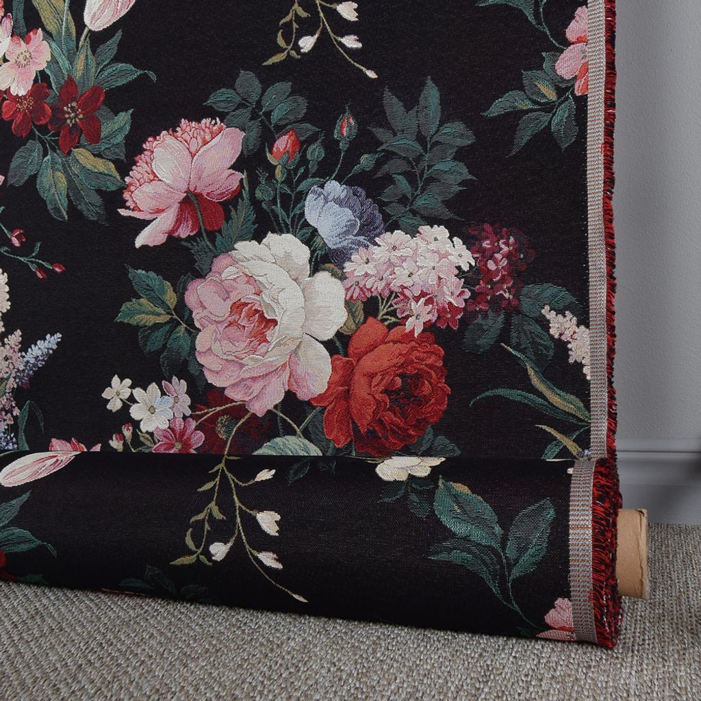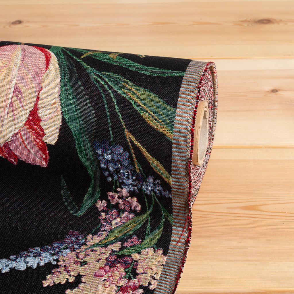 Fint gobeläng tyg på metervara med svart botten och en färgglad blombukett med rosor och tulpaner.