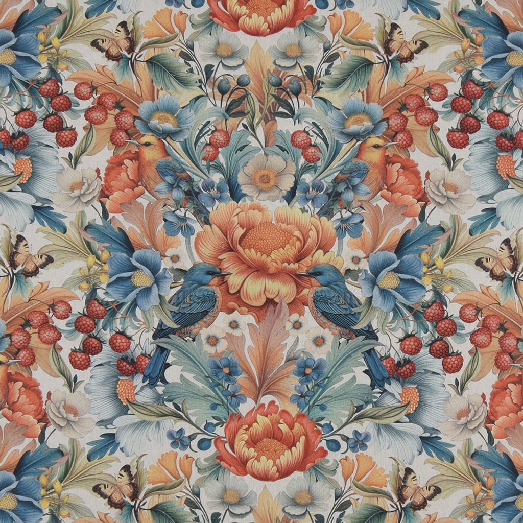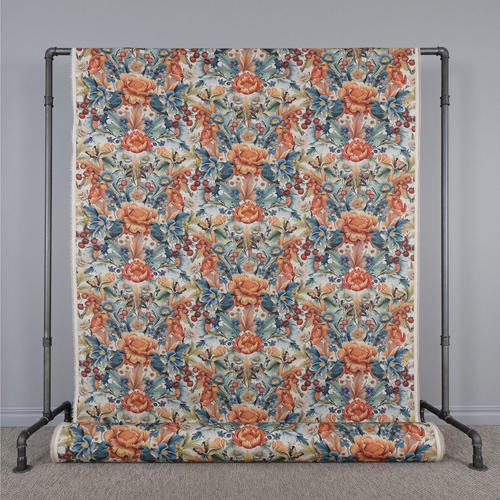 Bloom Fruit Paradise , ett gardintyg i linnelook med ett livfullt och detaljrikt blommönster. De varma tonerna av orange och rött blandas med svalkande blå nyanser, samtidigt som ljuvliga fåglar och bär ger en exklusiv känsla. Tygets Panama-vävning ger en vacker struktur som påminner om linne, men med 100% bomulls mjuka och följsamma egenskaper .