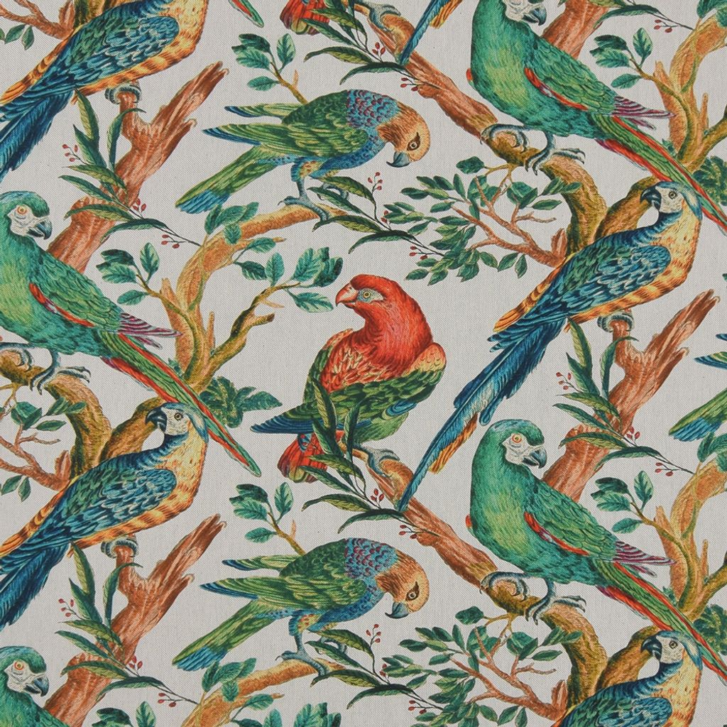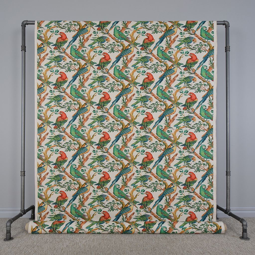 Tyg för gardiner och inredning med linnelock och motiv med papegojor, kvistar och blad. Vackert mönster som livar upp rummet.