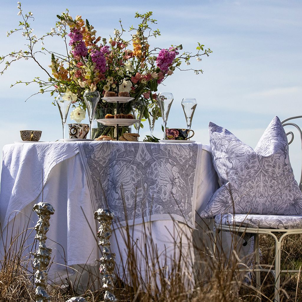 Pimpernel bordslöpare har ett detaljrikt mönster av William Morris i blått och vitt med blommor och blad. Designen ger din dukning en känsla av lugn och sofistikation, perfekt för både vardag och fest. Duken är framtagen av Ekelunds i samarbete med © The William Morris Society, tillverkad i Sverige av ekologisk bomull och ekologiskt lin, GOTS-certifierad.
