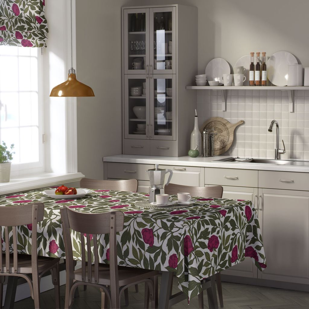 Ge ditt matbord en vacker och naturlig uppgradering med vår Pion bordsduk. Denna duk pryds av ett ljuvligt blommönster med pioner i rika nyanser av rosa och gröna blad, vilket skapar en harmonisk och inbjudande atmosfär i ditt hem. Pion bordsduk är perfekt för att sätta guldkant på både vardagsmiddagar och festligare tillställningar.