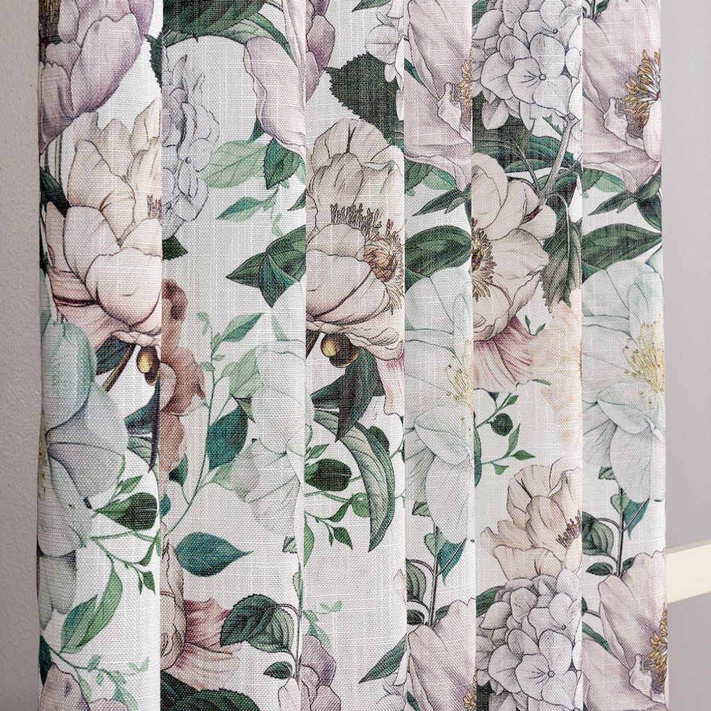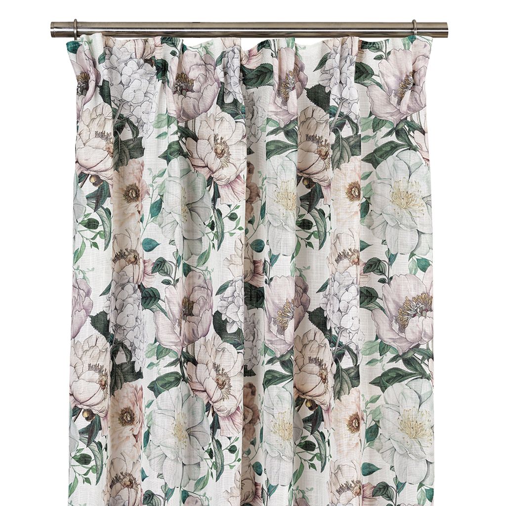 Pion offwhite är en romantisk gardin med storskaligt blommönster i milda pasteller. Den skapar ett mjukt ljusinsläpp och ett levande uttryck som lyfter rummet med elegans och karaktär.