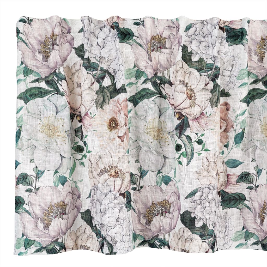 Pion offwhite är en elegant gardinkappa med kraftigare struktur och stort, romantiskt blommönster. Den ger rummet ett vackert fall, en exklusiv känsla och en livfull atmosfär.