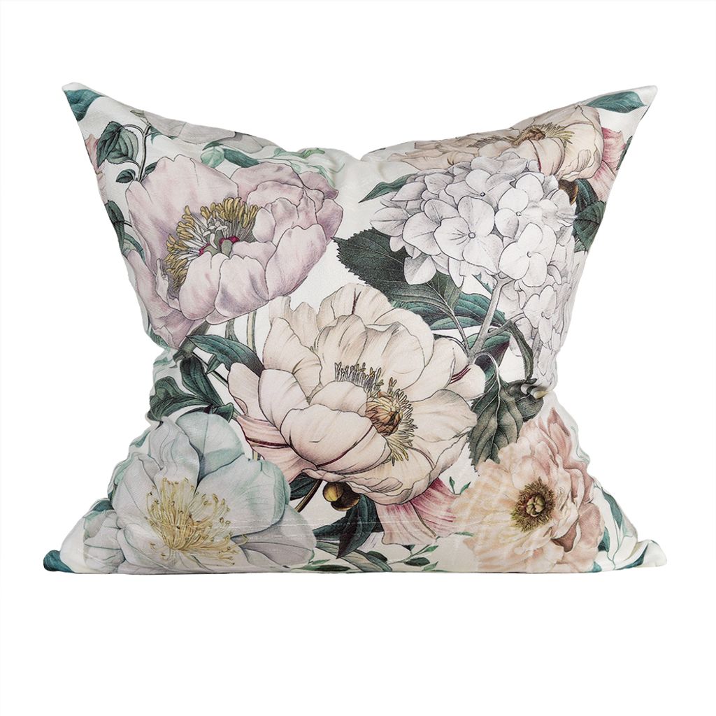 Pion är ett dekorativt kuddfodral i en ljus offwhite nyans, tillverkat i mjuk och fin sammet som ger en lyxig och behaglig känsla. Det uttrycksfulla blommönstret med pioner i mjuka, harmoniska färgtoner skapar en romantisk och levande känsla som tillför både elegans och personlighet till rummet.