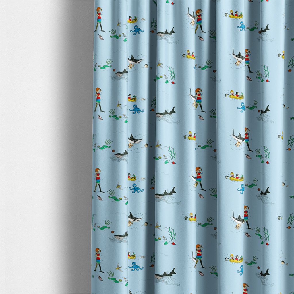 Följ med Pippi Långstrump på äventyr under havsytan! Ett lekfullt tyg med motiv från Pippi i Söderhavet – perfekt för barnrummet, gardiner eller kreativa syprojekt.