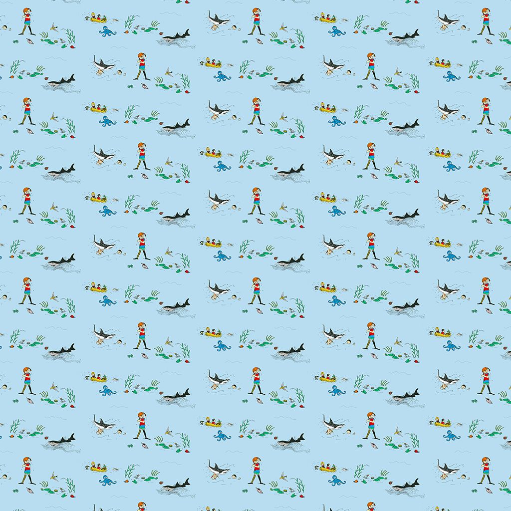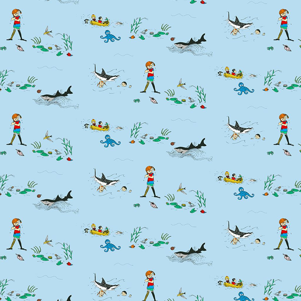 Pippi i Söderhavet blå är ett tyg fyllt av äventyr, färg och fantasi – precis som Pippi själv. Det ljusblå bomullstyget är täckt med härliga illustrationer där Pippi simmar bland exotiska fiskar, rider på hajar och utforskar det marina livet tillsammans med sina vänner. Designen är full av rörelse och berättarlust, vilket gör detta tyg till ett älskat val för barnrummet eller kreativa inredningsprojekt.