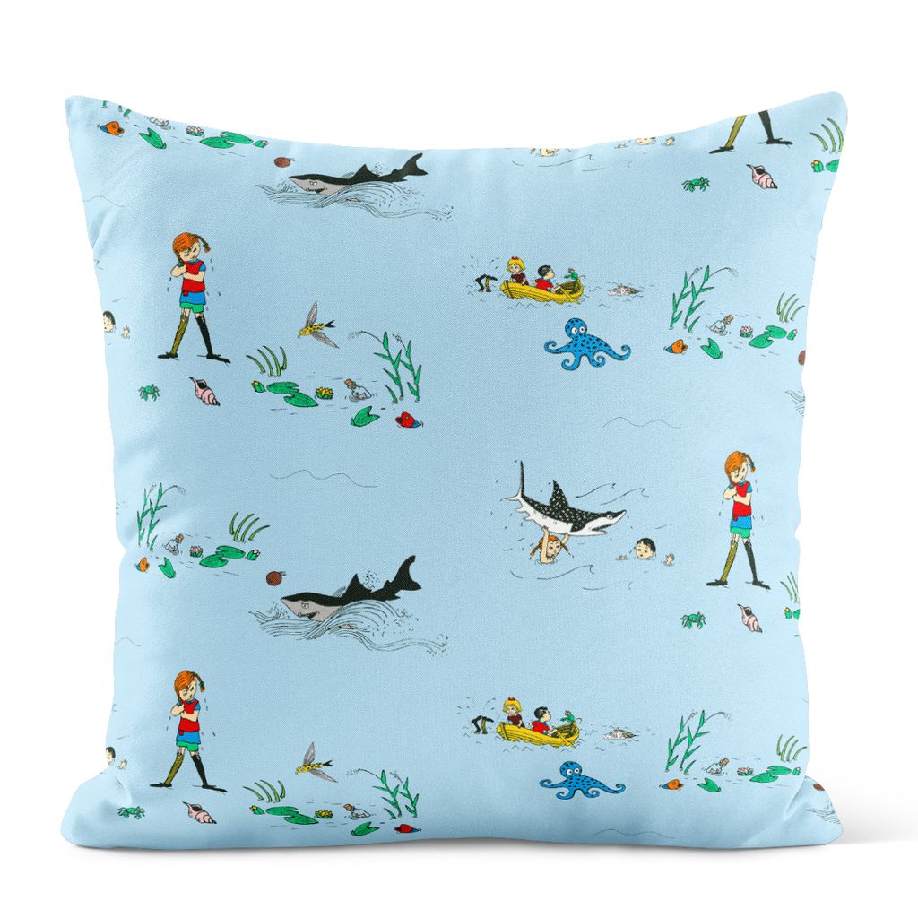 Kuddfodral i 100 % bomull med motiv från Pippi i Söderhavet – lekfullt mönster på klarblå botten. Mönsterplaceringen varierar, vilket gör varje kuddfodral unikt. Innerkudde ingår ej!
