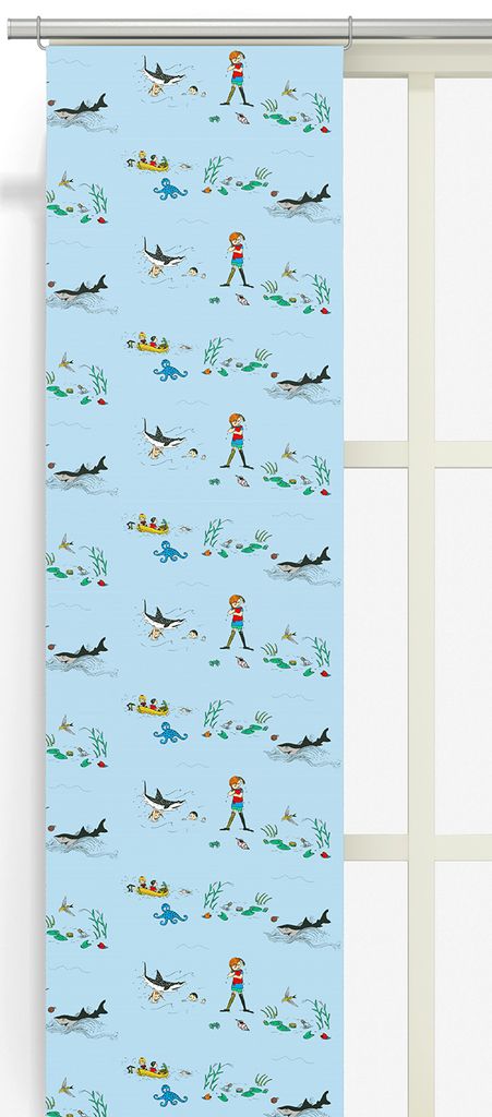 Beskrivning av Pippi i söderhavet panel – Blå Panelgardin