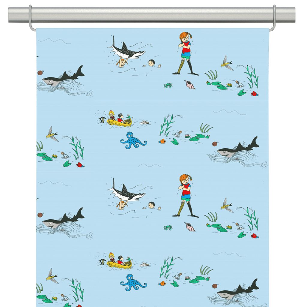 Den här panelgardinen från Arvidssons Textil med med Pippi Långstrump bland hajar, palmer och båtar – ett färgglatt och fantasifullt motiv som får barnrummet att leva.