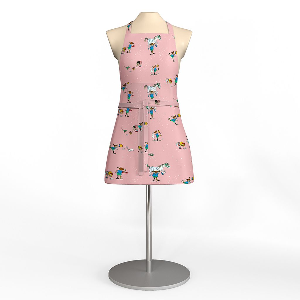 Rosa förkläde i 100 % bomull med Pippi, Lilla gubben och Annika – en färgglad och lekfull detalj i köket.