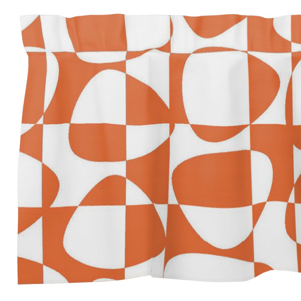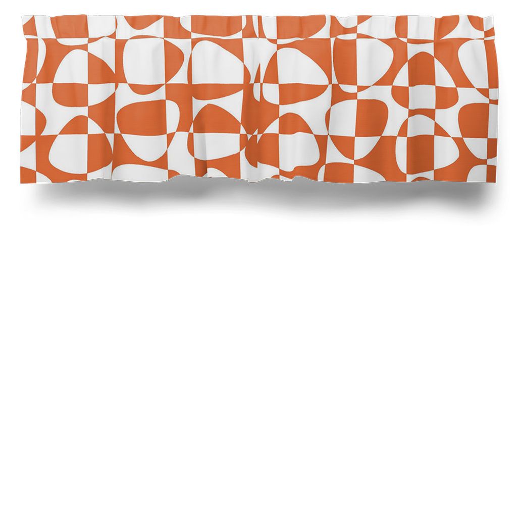 Gardinkappa på metervara med ett grafiskt mönster i orange på vit botten.