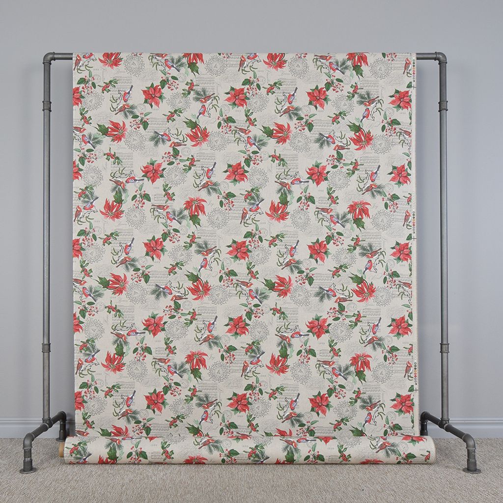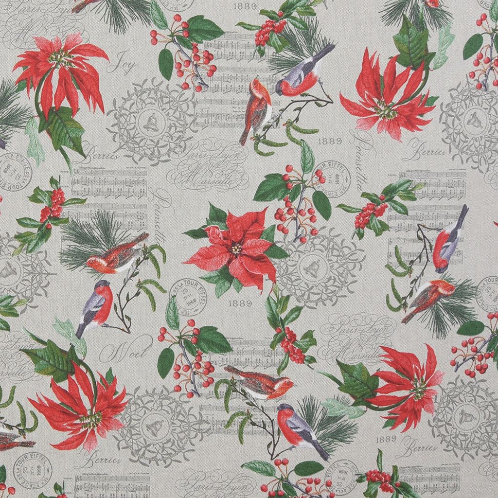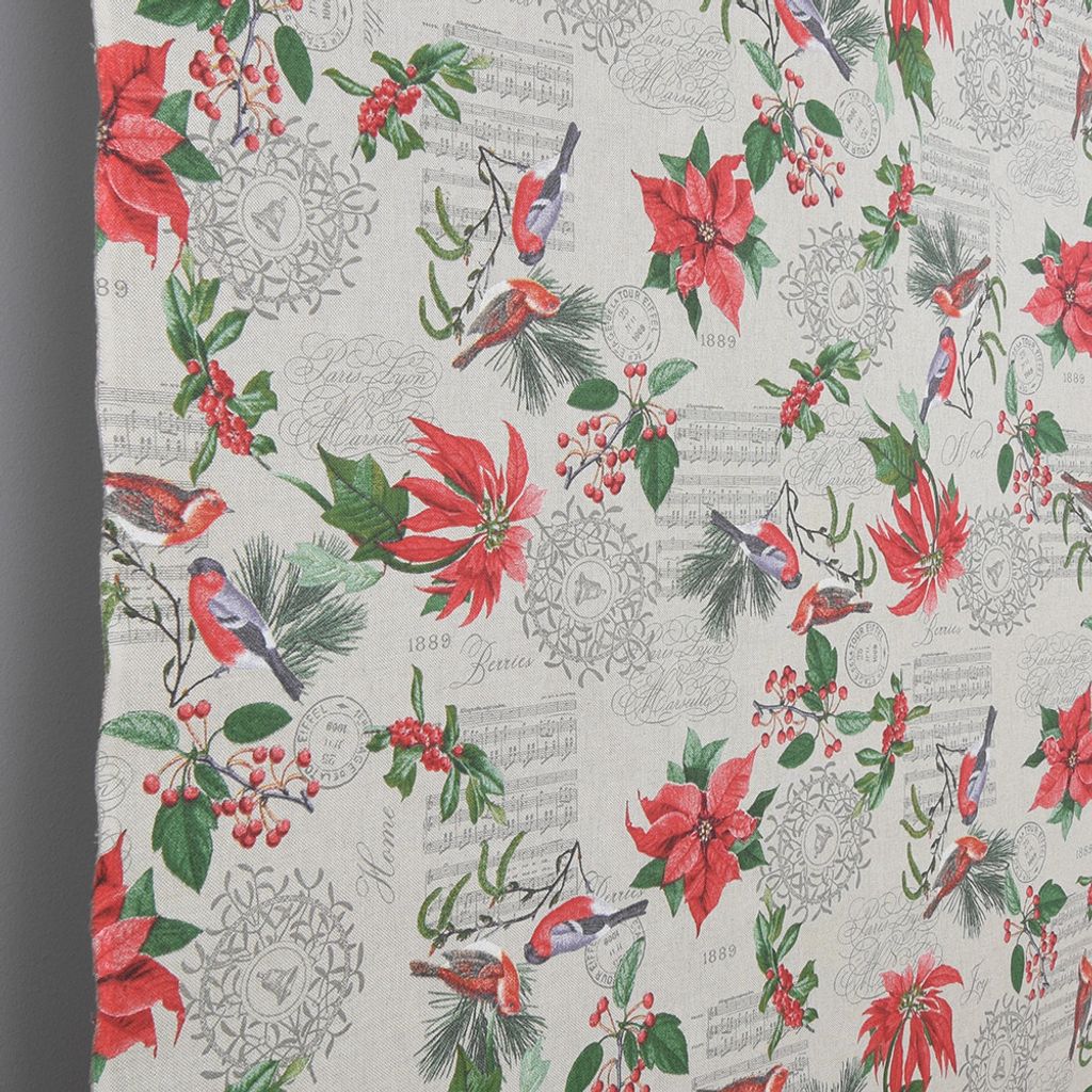 Tyg för gardiner och inredning med ett vacker mönster med julblommor, fåglar och noter på linne färgad botten.