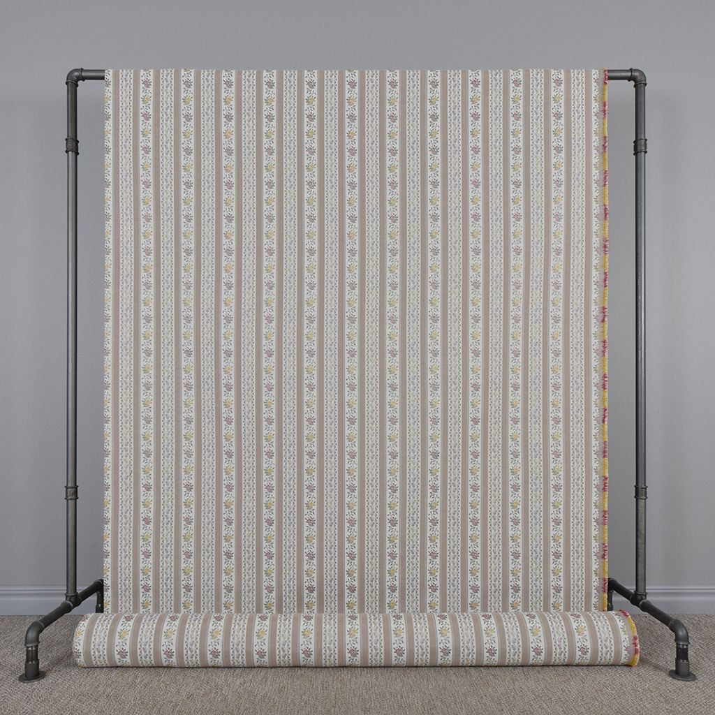 Portugal beige är ett klassiskt randigt möbeltyg i stiltappning med vackra blommor i milda färger. Tyget ger en tidlös känsla till både äldre och nyare möbler.