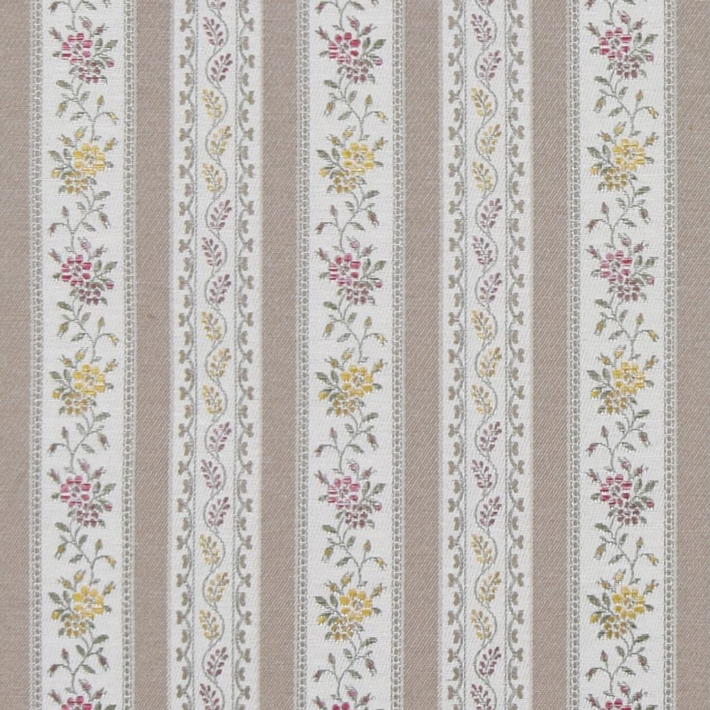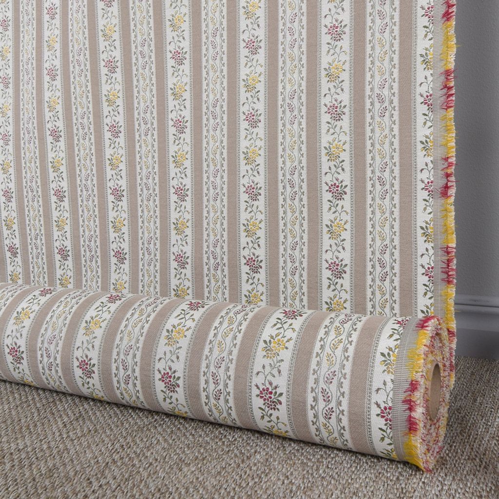 Portugal beige är ett stilsäkert möbeltyg med randigt mönster i varm beige ton kombinerat med smalare ränder i vitt och dekorationer av stiliserade småblommor i vinrött, gult och grönt. Den harmoniska färgskalan gör att tyget passar utmärkt i både lantlig och klassisk inredning.