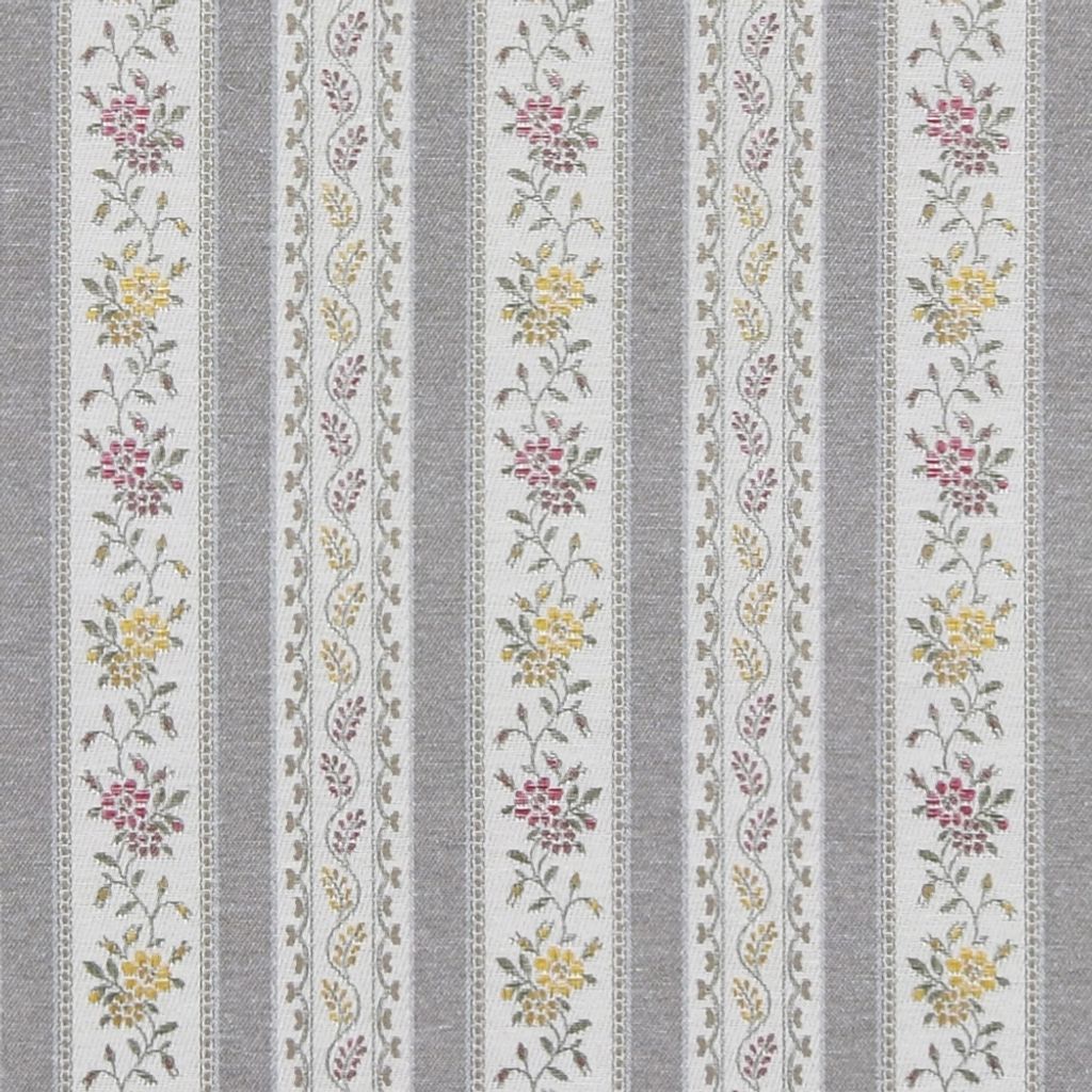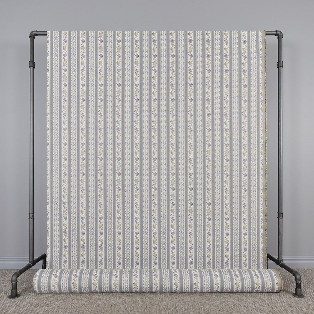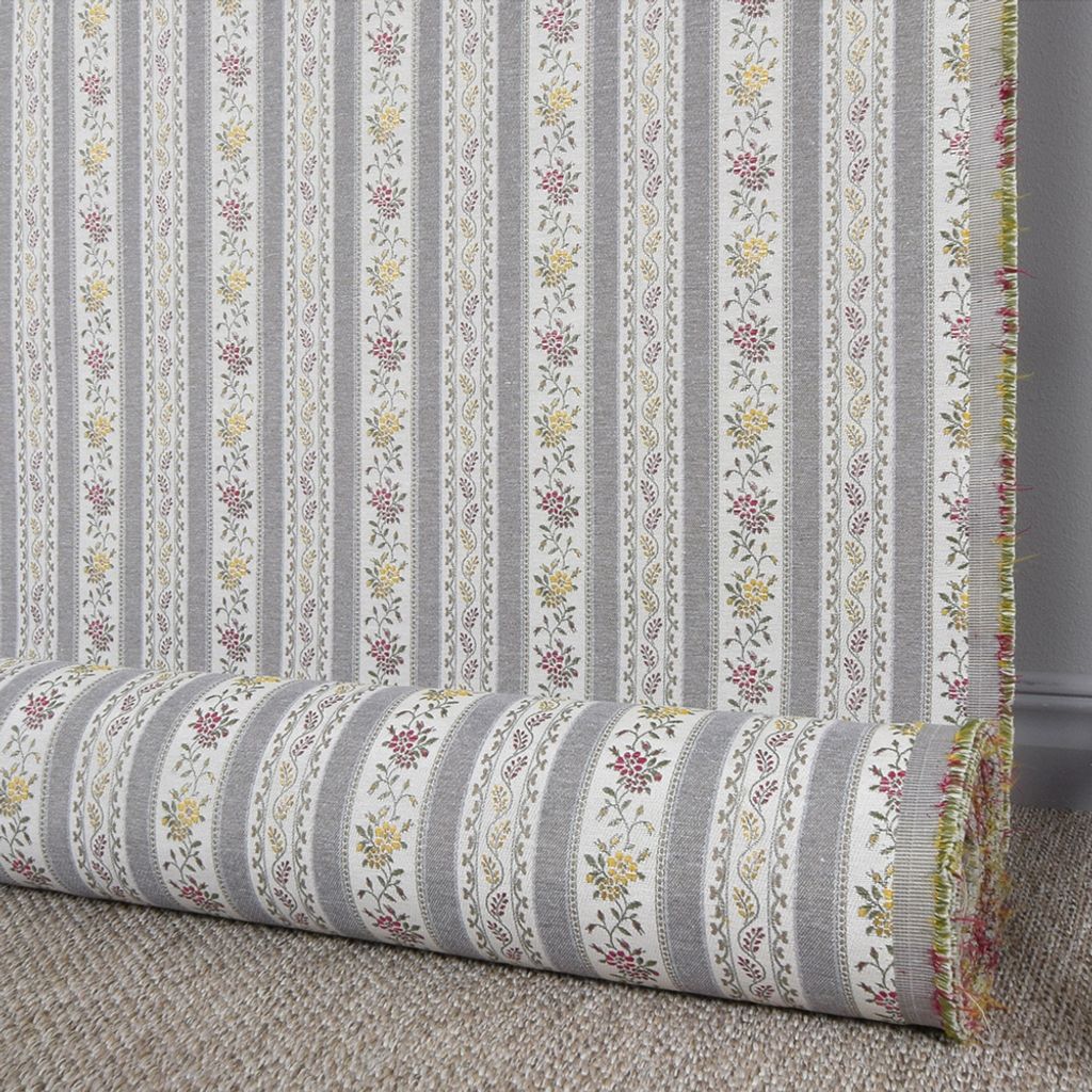 Portugal ljusgrå är ett randigt möbeltyg i klassisk stil med blomsterdetaljer i milda toner. Ett tåligt tyg som passar perfekt till omklädsel av stolar, soffor och andra inredningsprojekt där du vill skapa en tidlös och harmonisk känsla.
