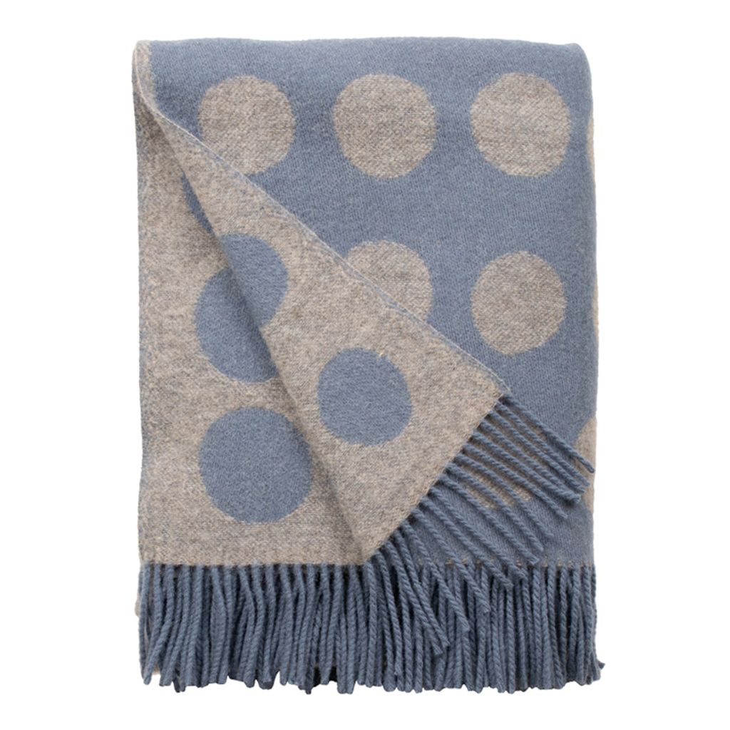 Pricktyg pläd blå beige har ett mönster i en mjuk blå ton i botten och beige prickar, är ett mönster där varje prick är handmålad och placerad med omsorg. Filten är spegelvända i färgerna på baksidan. 100% ull.