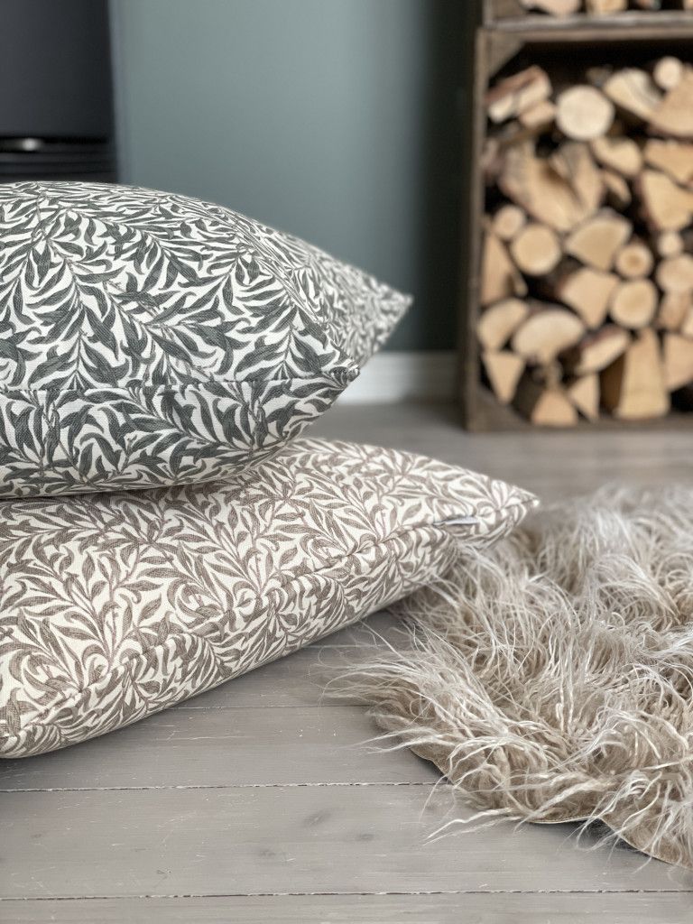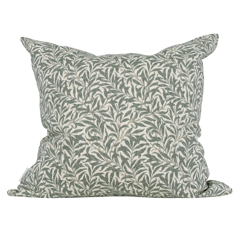 Kuddfodral med ett trendigt Morris motiv med blad rankor i allmogegrönt på offwhite botten.