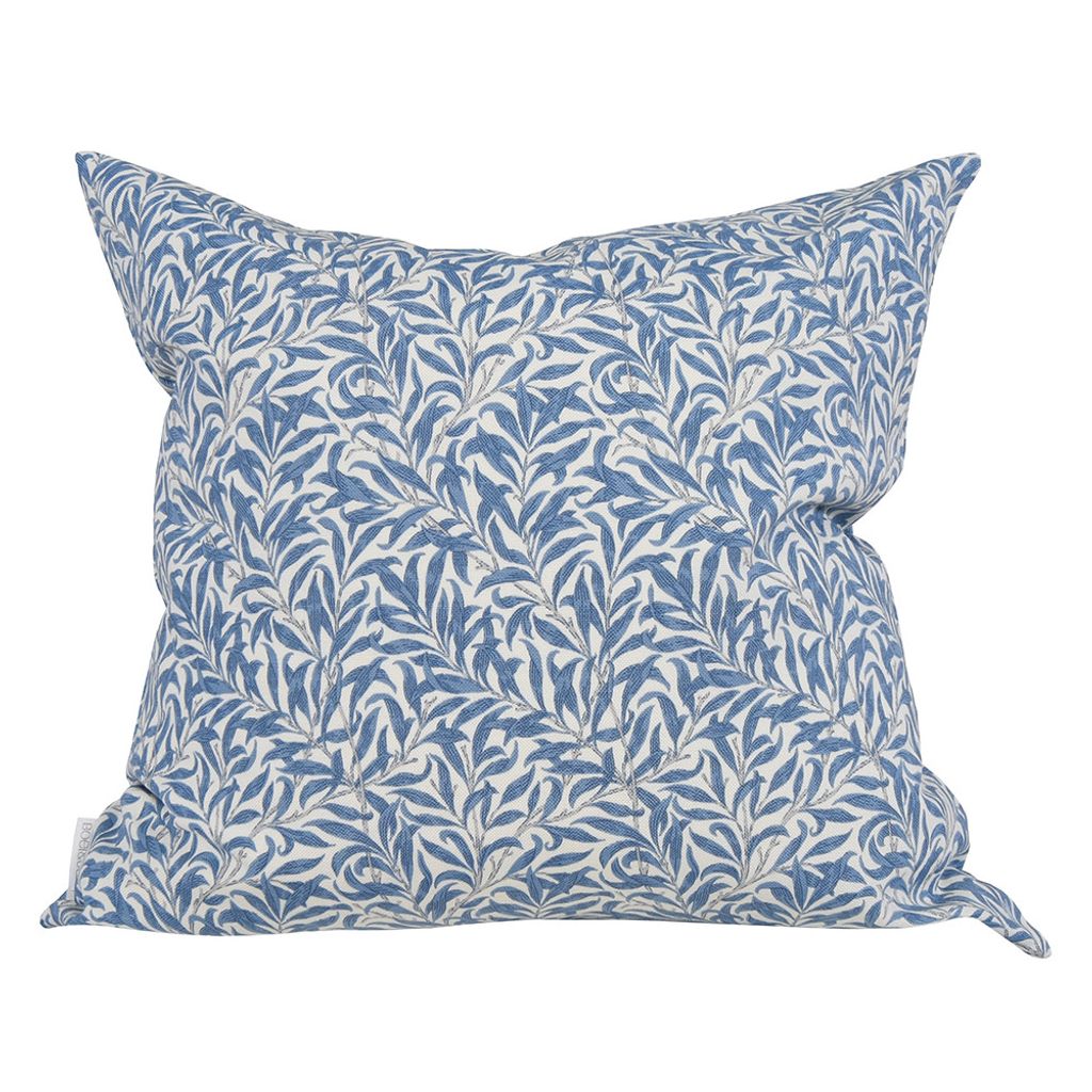 Kuddfodral med ett trendigt Morris motiv med blad rankor i blå på offwhite botten.