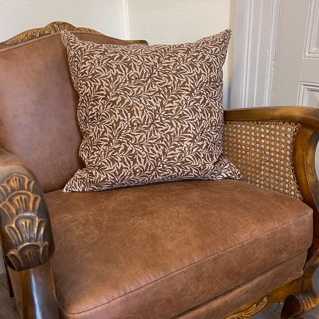 Snyggt kuddfodral i brunt och beige med blad mönster likt Morris.