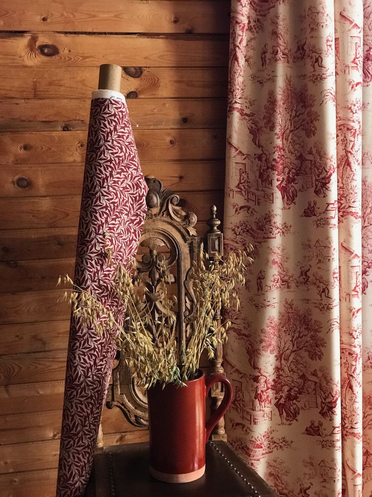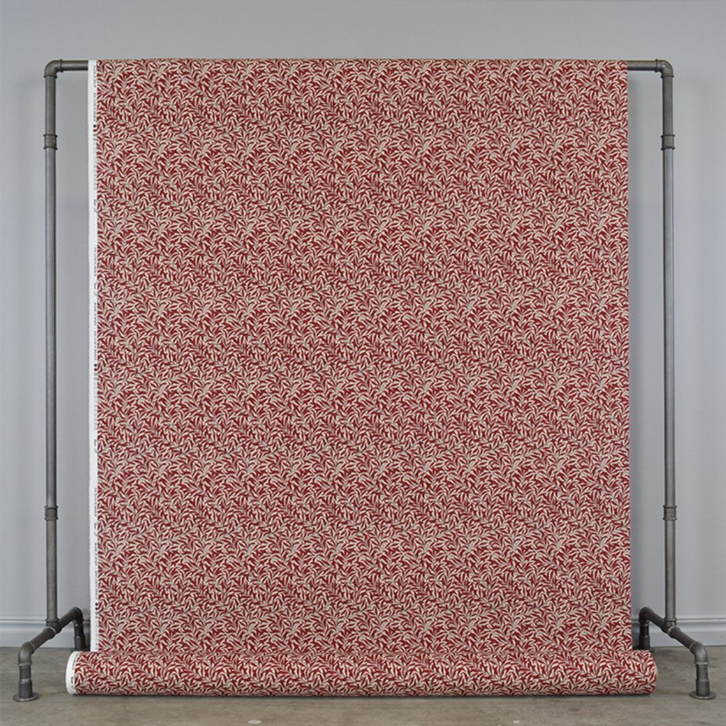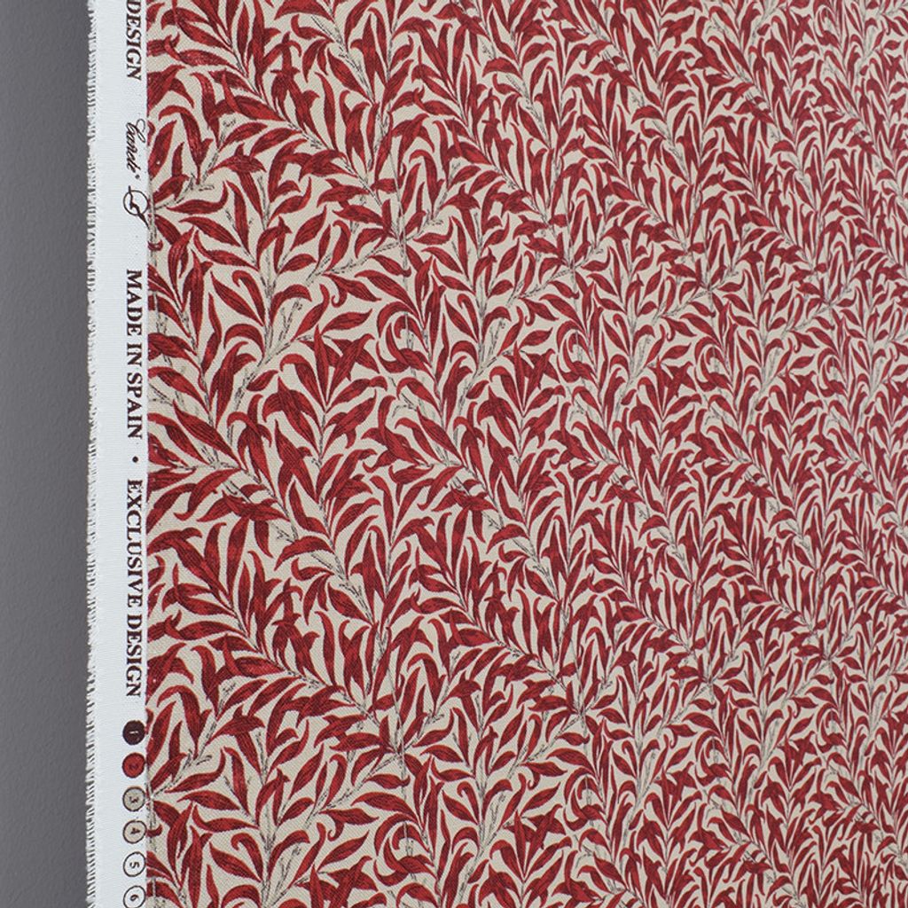 Inredningstyg med Morris inspirerat mönster. 20000md. Beige botten med röda färgade blad och beige kvistar