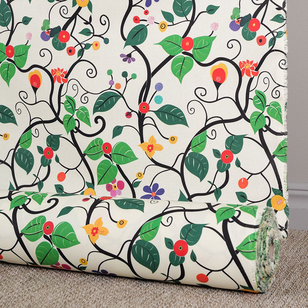 Rauma Garden är ett unikt gardintyg som andas kreativitet, färg och form. Mönstret består av slingrande svarta rankor fyllda med stiliserade blad, bär och blommor i klara färger som rött, grönt, gult, lila och blått. Den ljusa bottenfärgen lyfter fram det grafiska uttrycket och skapar en livlig men balanserad helhet.