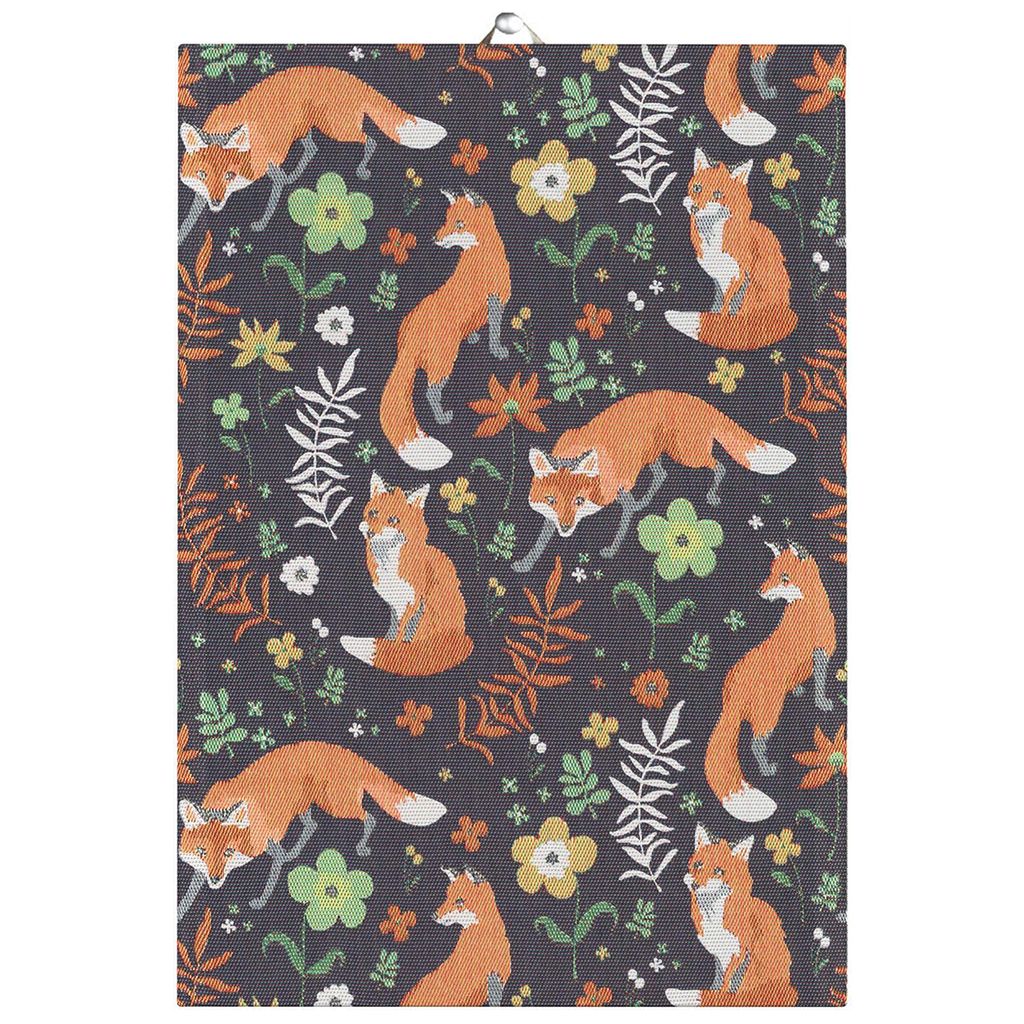 Rävrike kökshandduk kombinerar funktion med ett uttrycksfullt och lekfullt designmönster. Motivet föreställer rävar i olika poser, omgivna av blommor och blad i harmoniska färger som skapar liv och personlighet i köket. Den mörka bottenfärgen ger mönstret ett fint djup och gör handduken till ett dekorativt inslag även när den hänger framme.