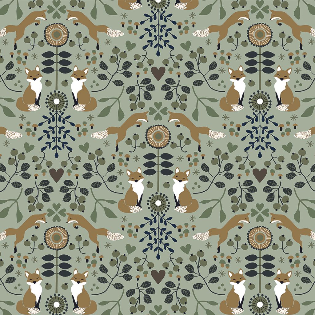 Mönstret Rävstigen grön ger en känsla av naturens magi och lekfullhet, samtidigt som det har en tidlös, folkloristisk charm. Tyget har en mjukt grön bakgrund med framträdande detaljerade rävar i varma bruna toner, omgivna av blomster och blad i nyanser av blått, grönt och gult.
