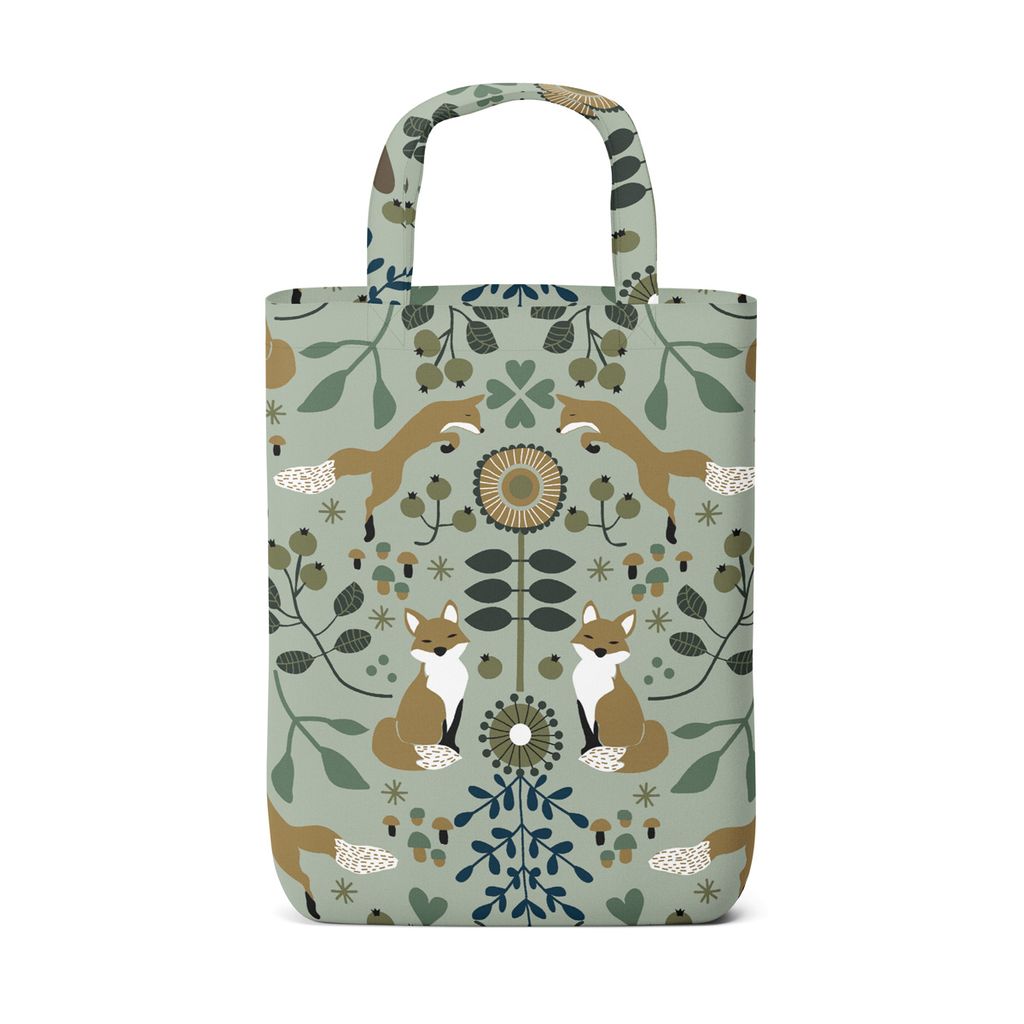 En tygkasse med ett lekfullt mönster av rävar och naturdetaljer i gröna nyanser. Perfekt för shopping och vardagsanvändning. Bilden visar endast exempel på hur kassen kan se ut. Det kan skilja sig beroende på hur tyget är tillklippt.
