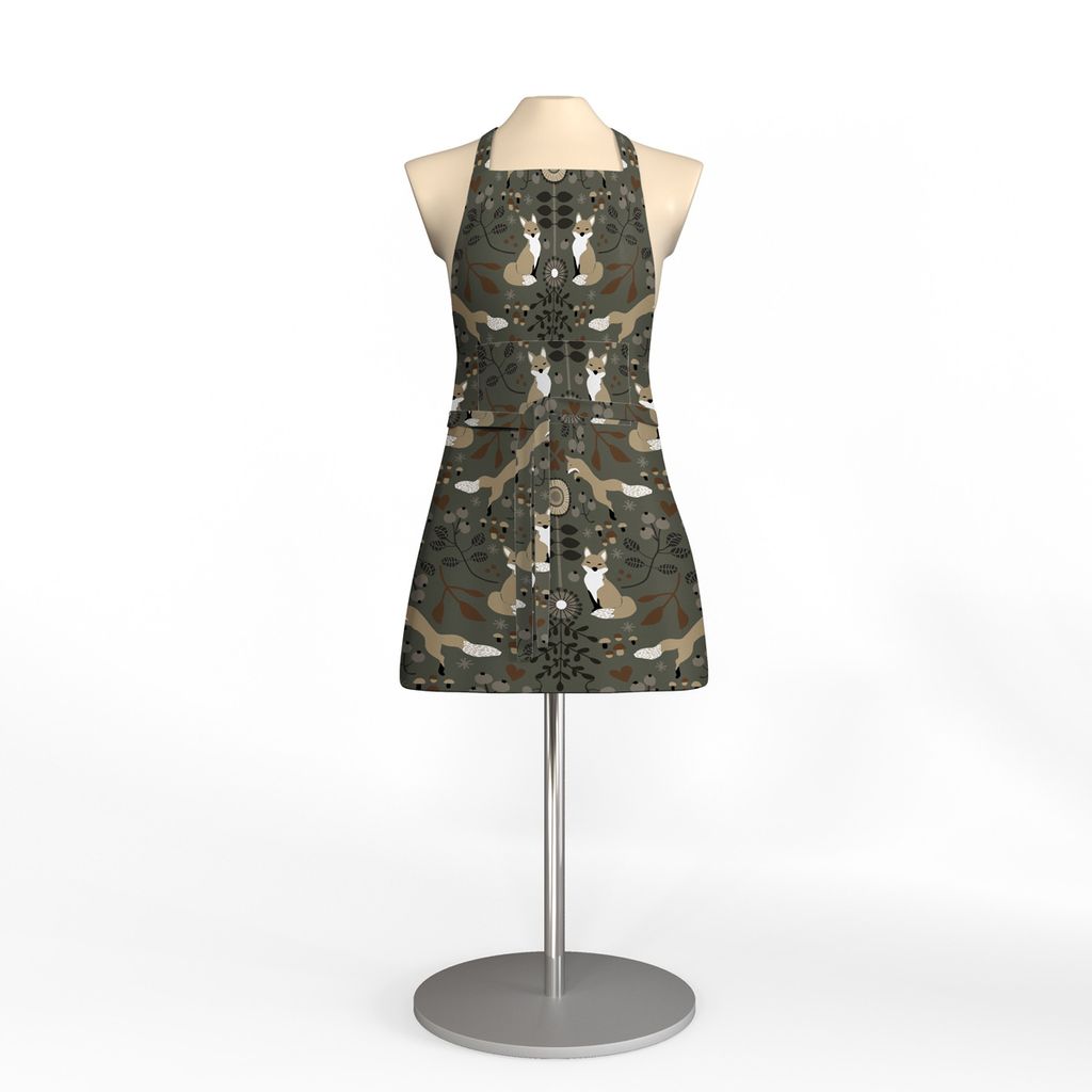 Ett naturnära förkläde i khaki-grönt med charmigt räv- och skogsmotiv. Perfekt för den som vill ha ett praktiskt och stilfullt inslag i köket. En stor ficka fram och med reglerbara band.
