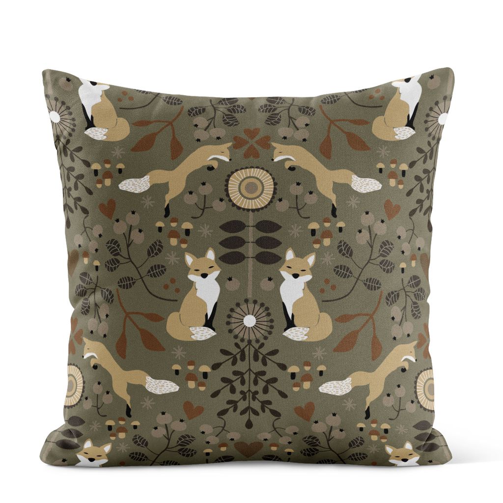 Rävstigen khaki kuddfodral förenar charm och natur med sitt mönster av rävar och skogsinspirerade detaljer i en härlig khakigrön nyans.