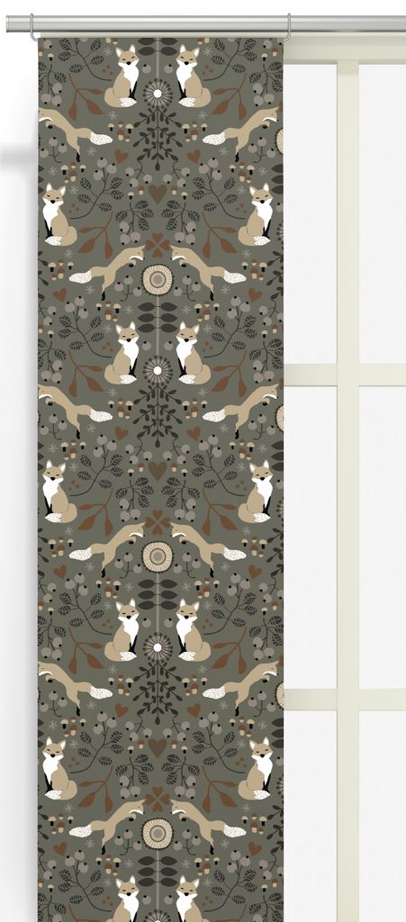 Rävstigen khaki panelgardiner i 100% bomull, dekorerade med ett lekfullt räv-mönster på en mjuk khakigrön bakgrund. Perfekt för att skapa en varm, naturinspirerad inredning.