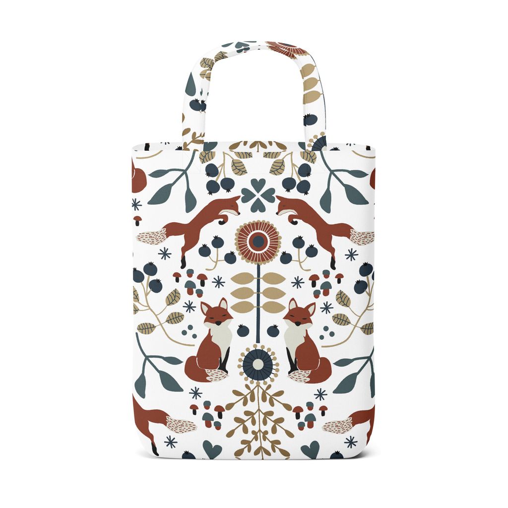 En tygkasse med ett charmigt mönster av rävar och skogselement i rött och naturfärger på vit bakgrund. Perfekt för shopping och utflykter. Bilden visar endast exempel på hur kassen kan se ut. Det kan skilja sig beroende på hur tyget är tillklippt.