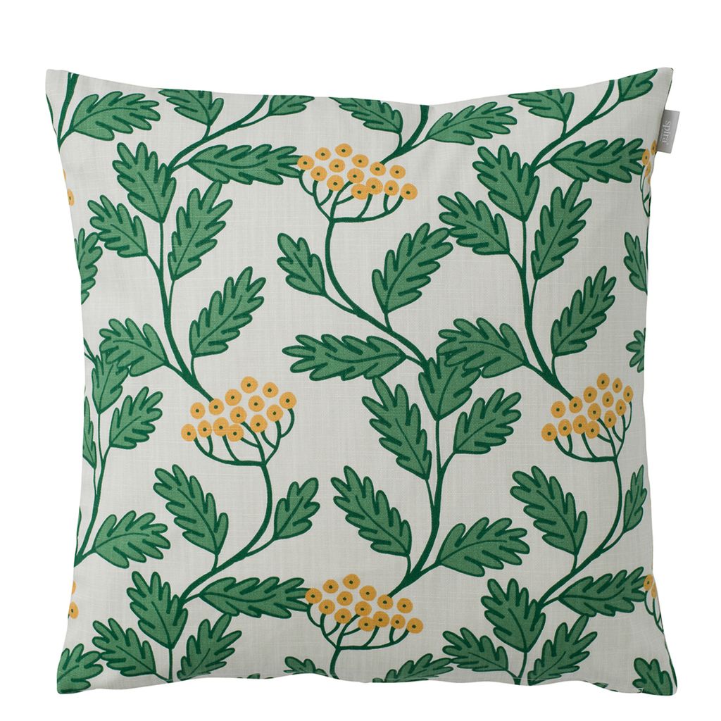 Ge soffan eller sängen en naturlig och livfull känsla med kuddfodralet Renfana grön från Spira of Sweden. Det charmiga motivet föreställer den välbekanta växten renfana med dess djupt gröna, flikiga blad och små senapsgula blomklasar. Trycket ger ett lekfullt men ändå elegant uttryck som fångar den svenska sommarfloran i textil form.