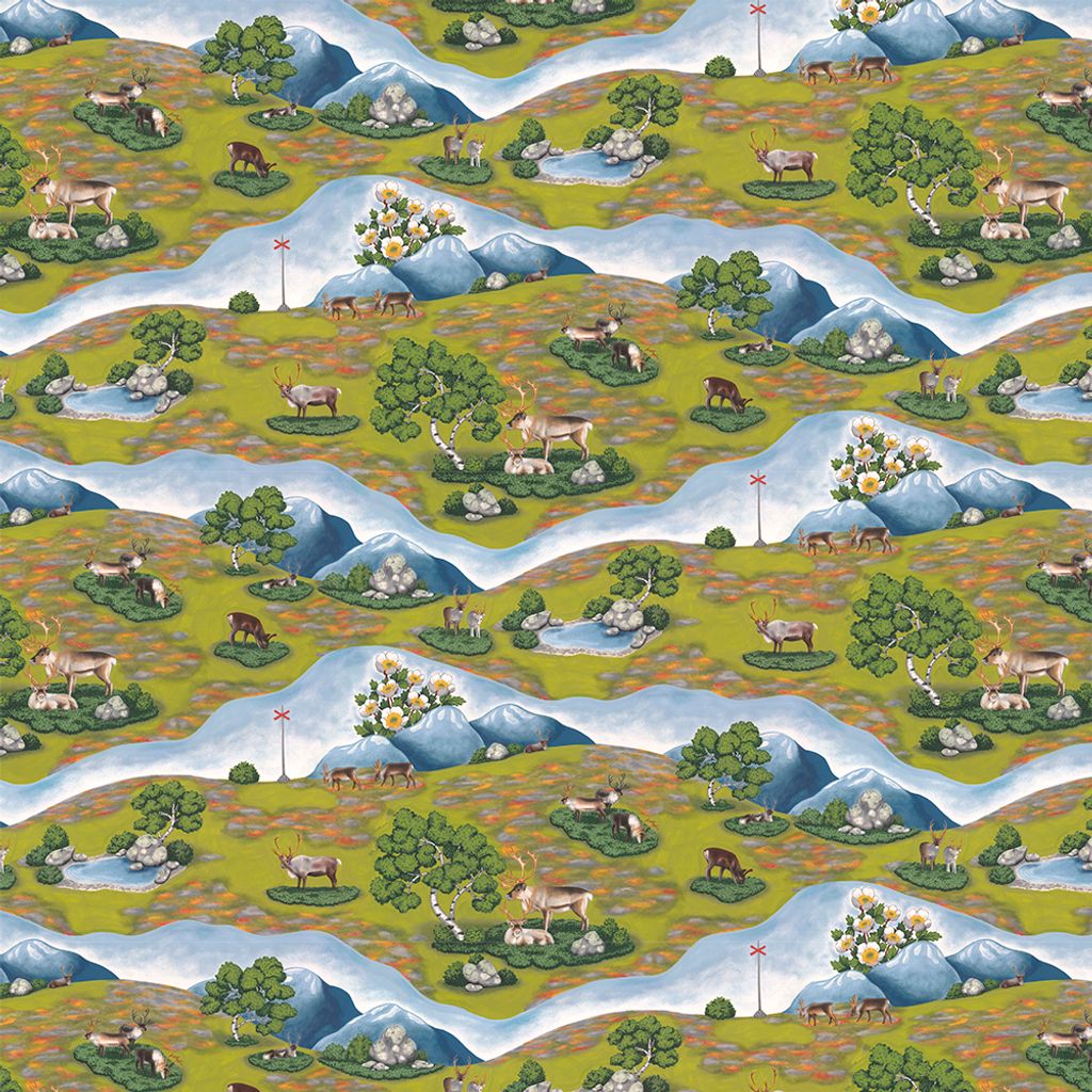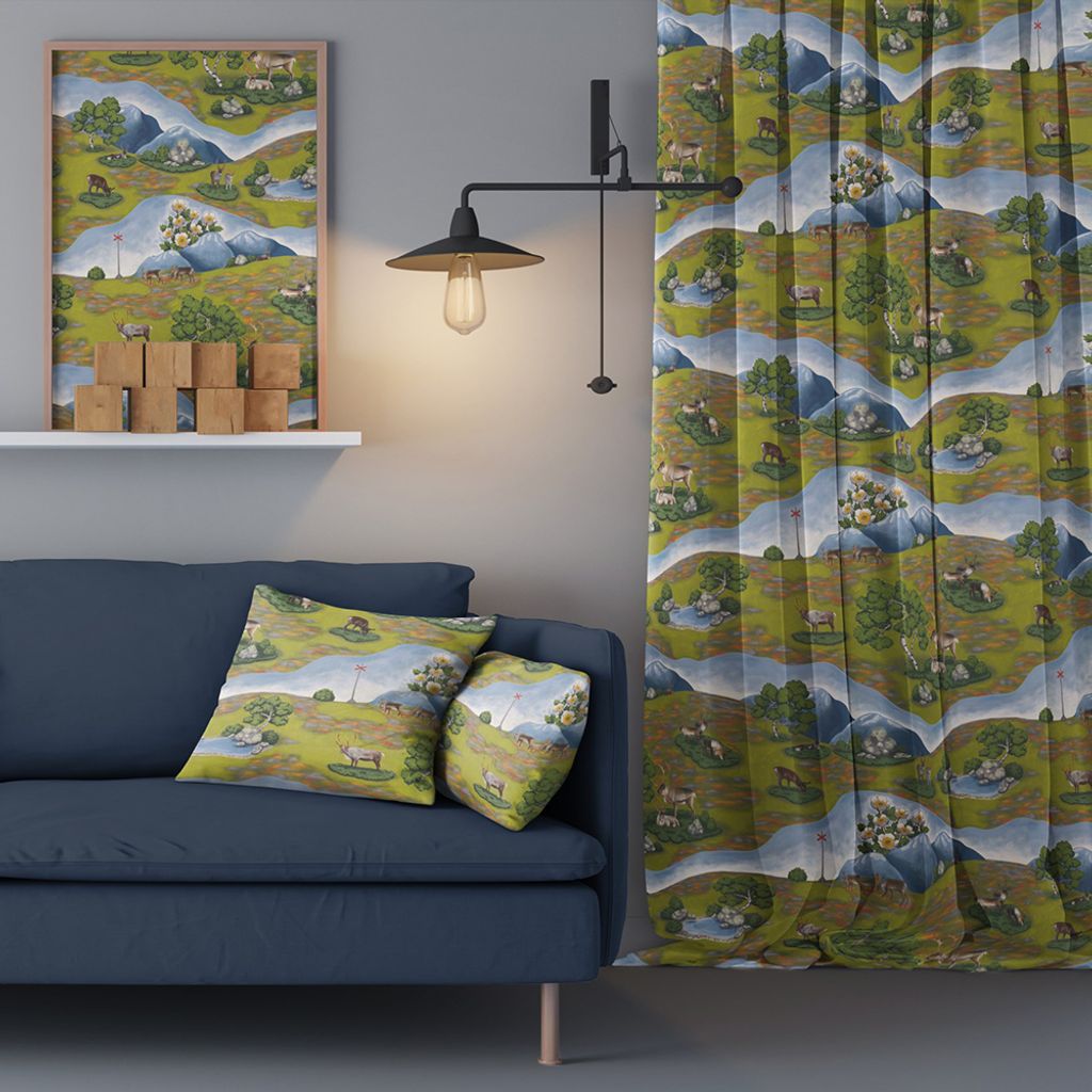 Tyget Renvandring med renar, fjäll och blommor som gör sig bra till gardiner, kuddar, duk, väskor m.m.