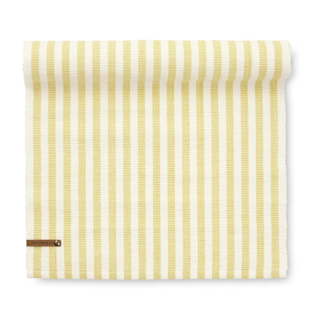Reya gul är en stilfull bordslöpare som kombinerar ett klassiskt randigt mönster med en varm och inbjudande färgton. De mjuka gula ränderna mot den ljusa botten skapar ett livfullt men harmoniskt uttryck som lyfter dukningen och ger bordet ett fräscht och ombonat intryck.