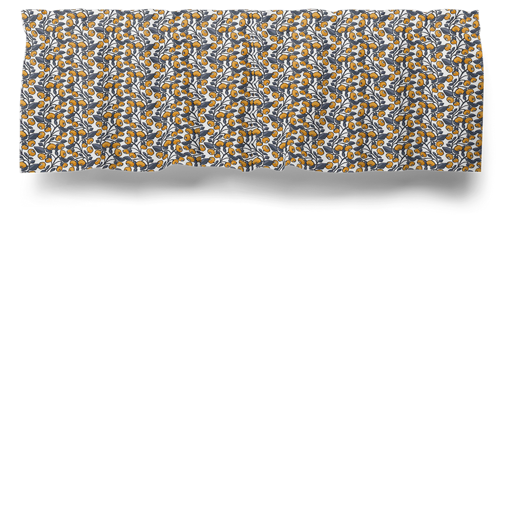 Gardinkappa på metervara med multiband och ofållade sidor. En gardinkappa med vit botten med gula bär och grå blad