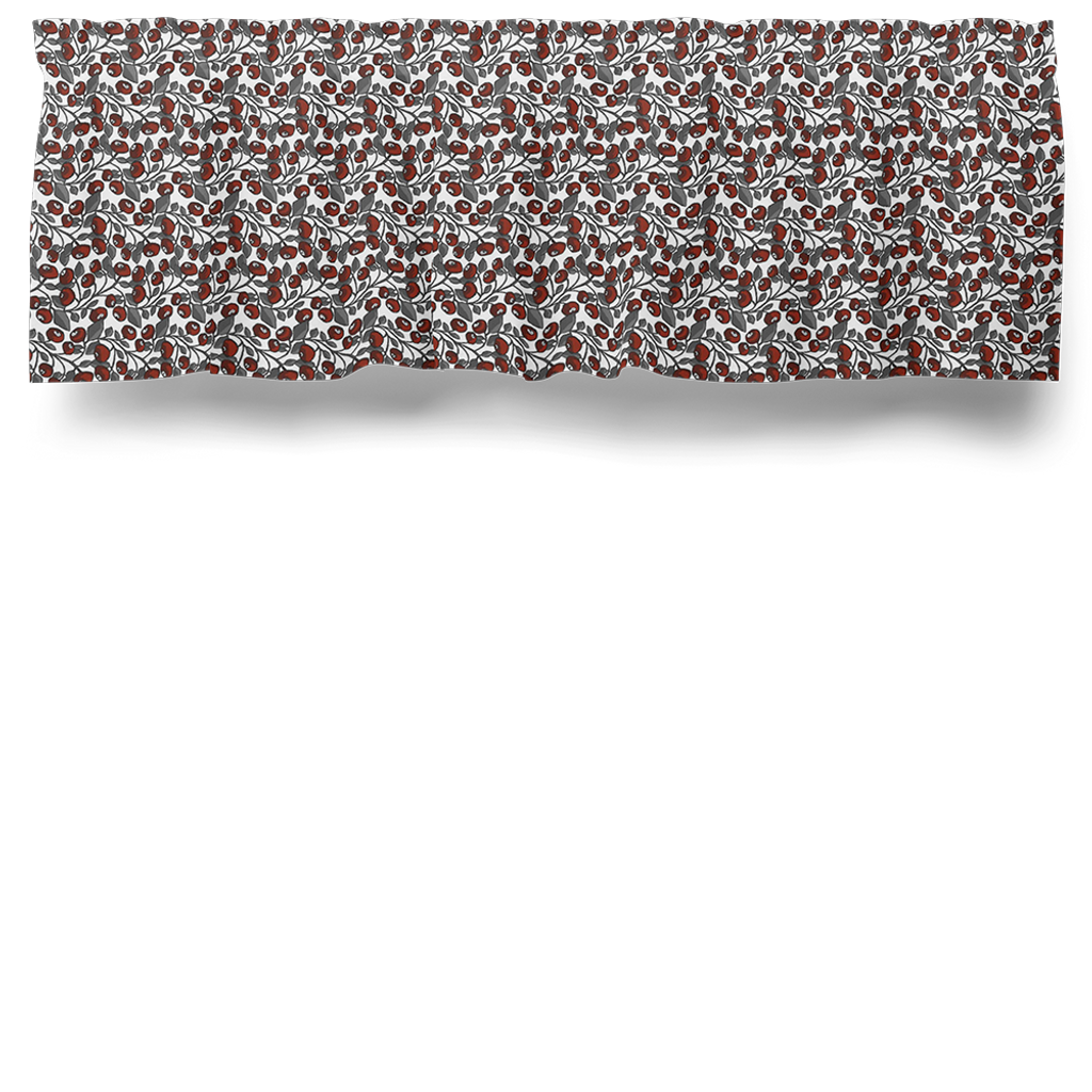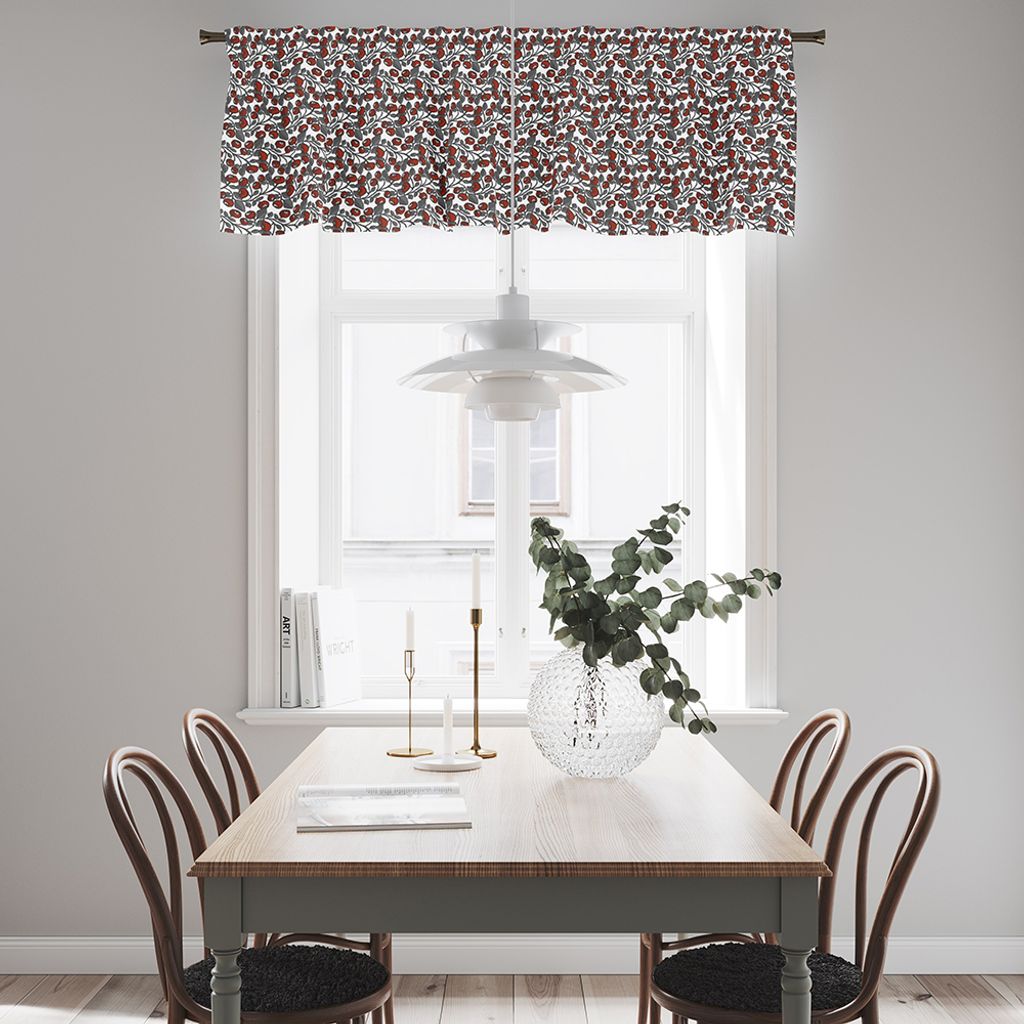 Gardinkappa på metervara med multiband och ofållade sidor. En gardinkappa med vit botten med röda bär och grå blad