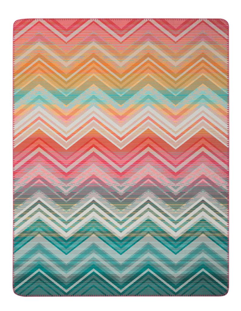 Riviera Mirage är en färgstark och uttrycksfull filt med ett livfullt zigzagmönster i somriga nyanser. En dekorativ pläd som tillför energi, värme och personlighet – perfekt både ute och inne.