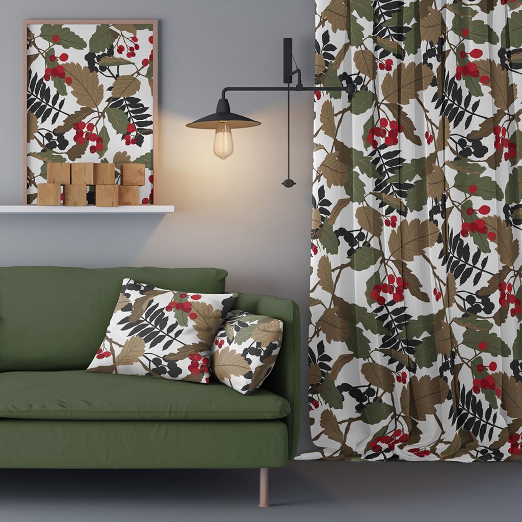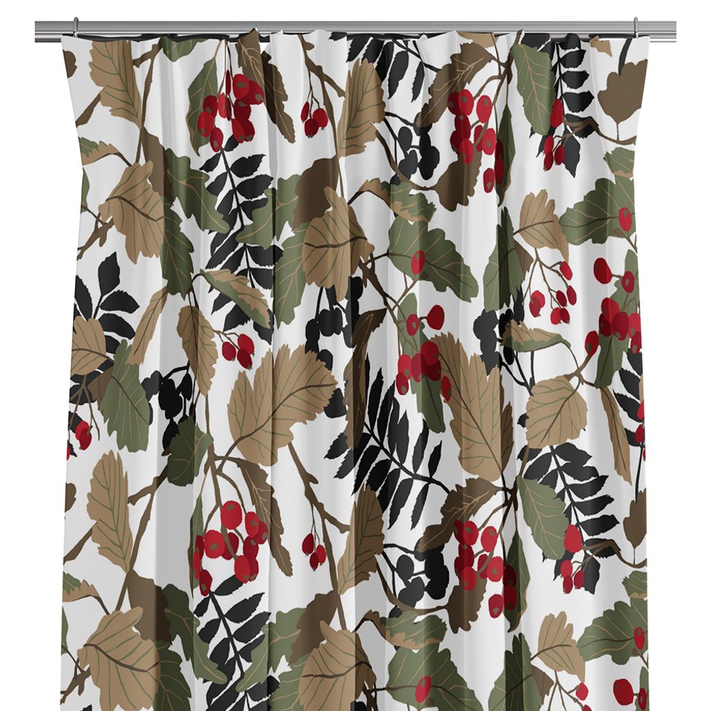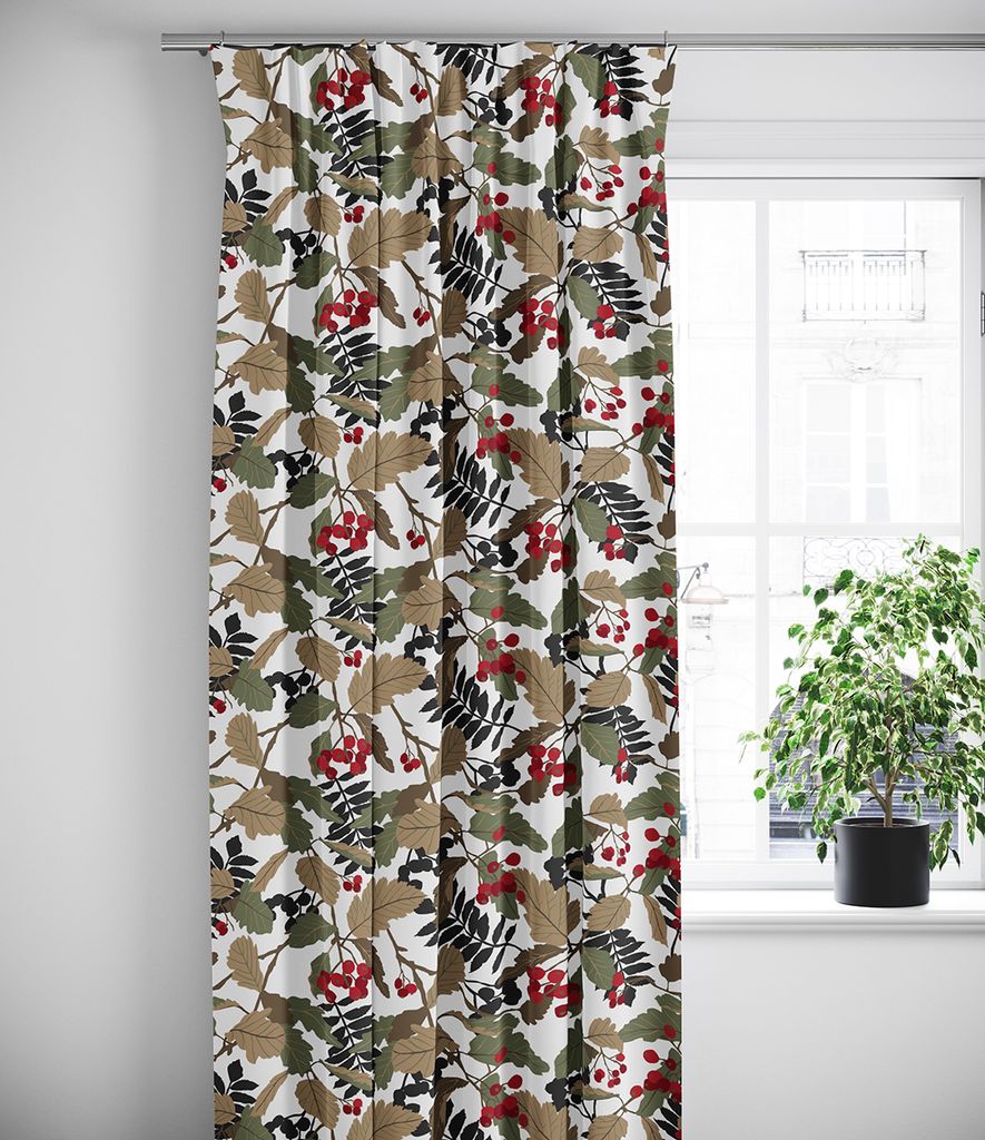 Höstgardiner på en vit botten med löv och rönnbär i grönt, beige och rött.